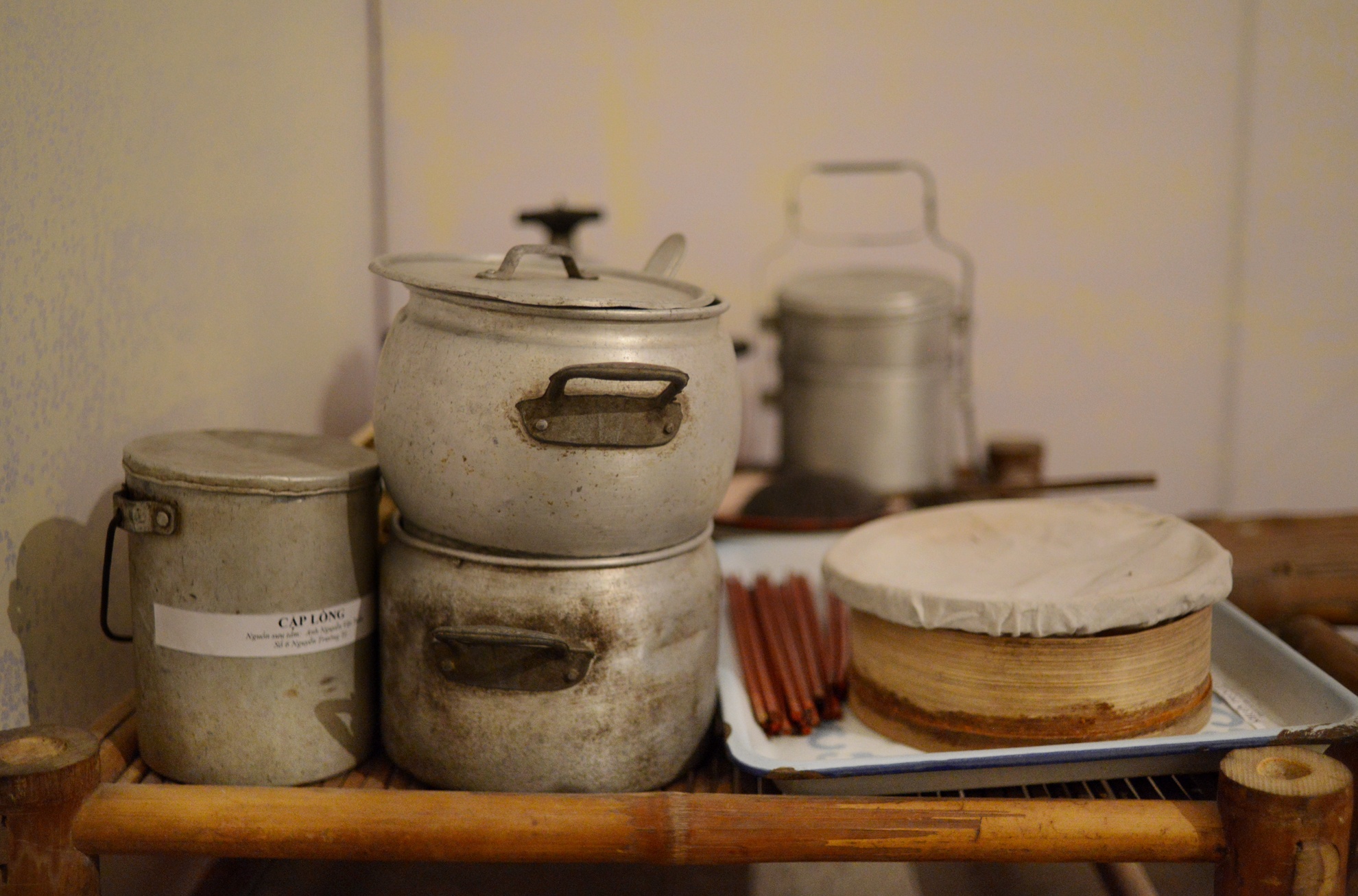 Bộ nồi, cặp lồng, phích trong gian bếp.