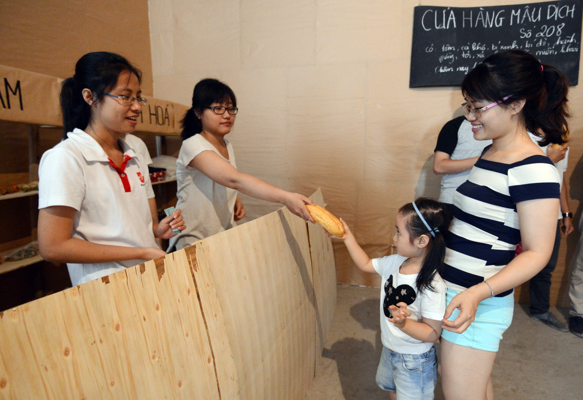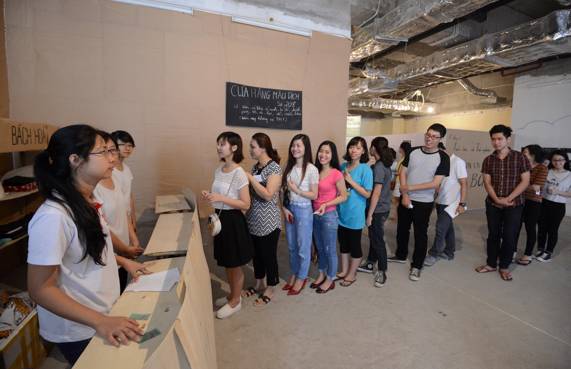 Khách đến dự triển lãm tại một tòa nhà ở Hà Nội được phát tem phiếu xếp hàng mua bánh mì để trải nghiệm cảnh tượng thời bao cấp trước 1986.