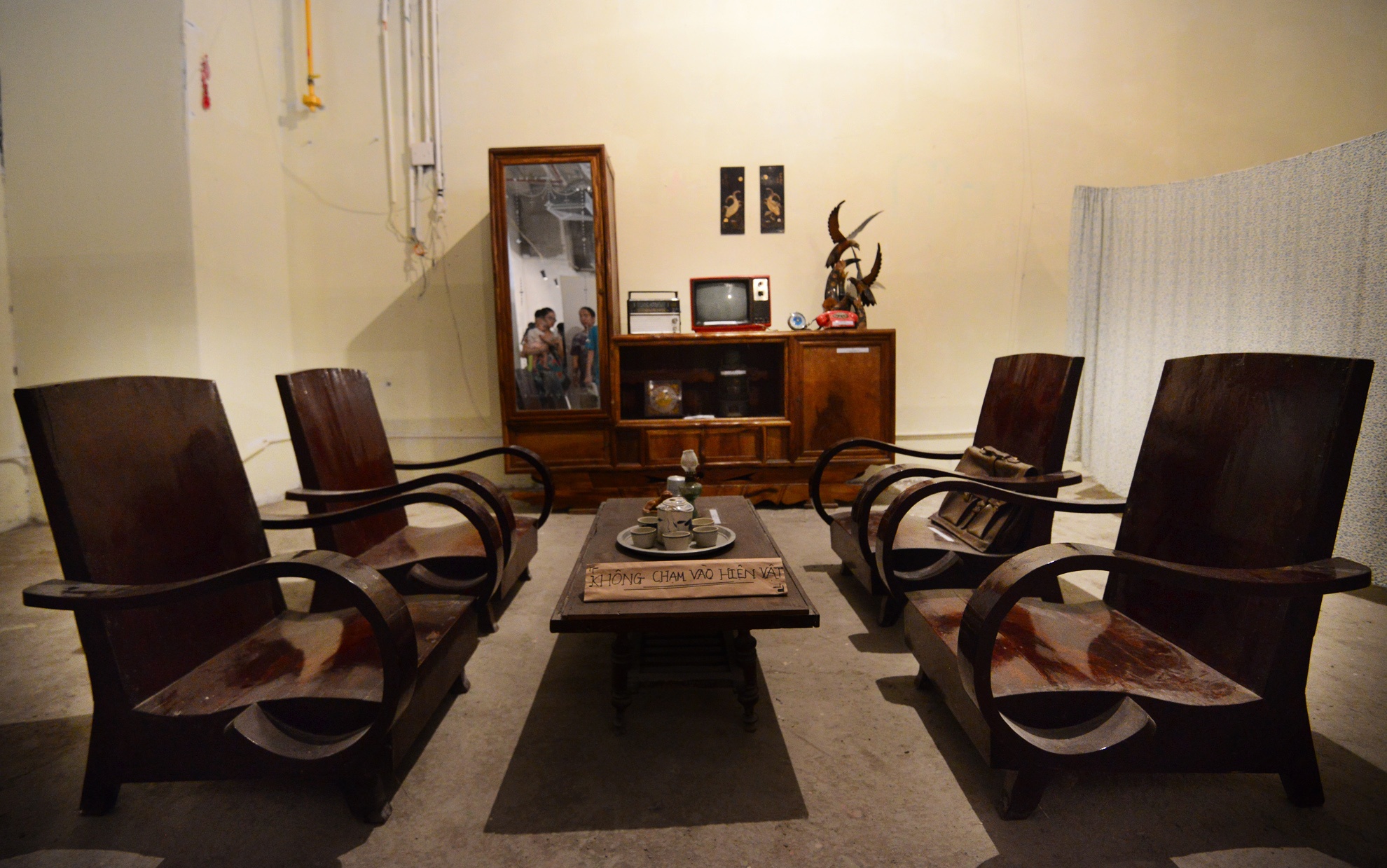 | Không gian mô phỏng phòng khách của một gia đình thời bao cấp với bộ bàn ghế salon gỗ, tủ lệch tráng gương, bộ ấm chén, đèn dầu. |