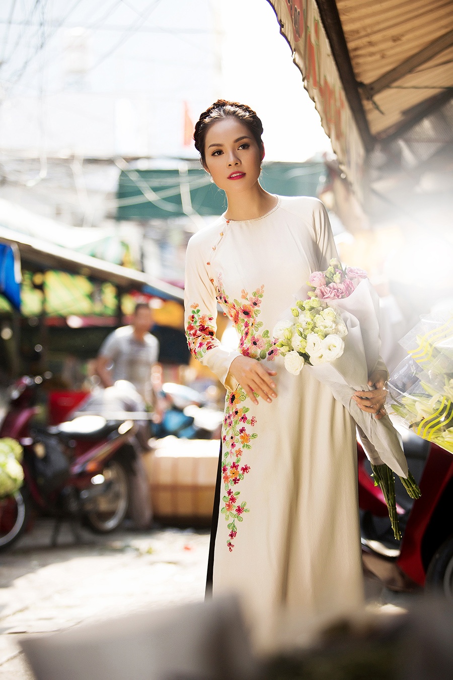 Ải mỹ nhân đi chợ hoa tại TP HCM. Người đẹp làng phim Việt duyên dáng trong tà áo dài trắng, điểm hoạ tiết thêu tinh tế ở thân áo, phối cùng quần tông đen cổ điển. Để phù hợp trang phục ngày xuân, cô trang điểm ngọt ngào, tóc tết nữ tính. |