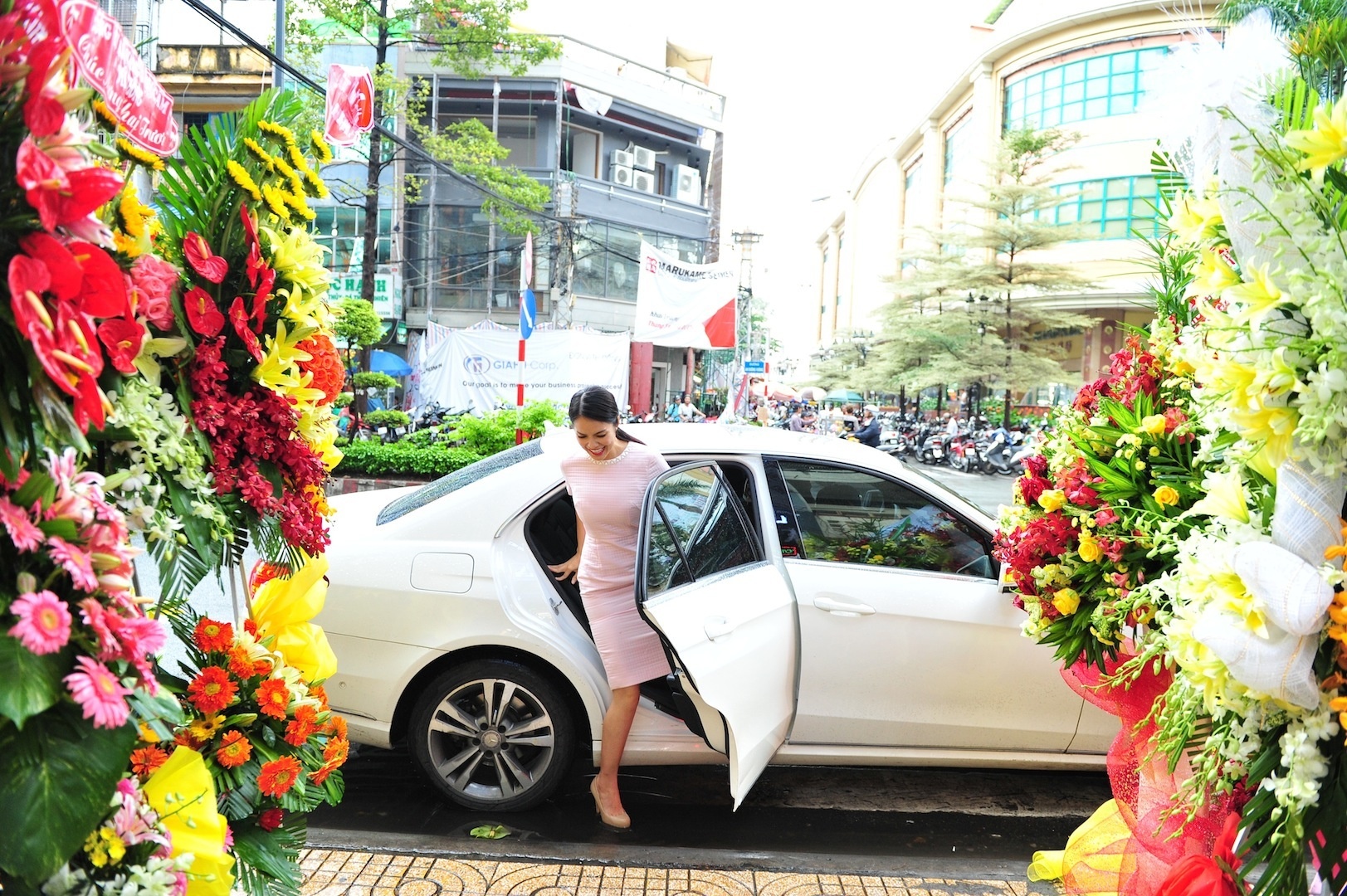 Người đẹp phim "Like: Tình yêu, thời trang, khăn rằn" diện trang phục hợp mốt, được đưa đón bằng ô tô sang trọng khi đến dự tiệc khai trương tại TP HCM.