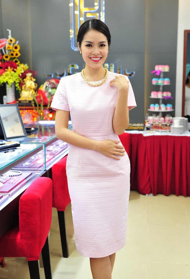 Diễn viên phim Lòng dạ đàn bà nổi bật trong bộ đầm ôm dáng, màu pastel nhã nhặn. Cô cột tóc gọn gàng. Sau dự án phim truyền hình Like: Tình yêu, thời trang, khăn rằn, người đẹp 33 tuổi bận rộn với những cảnh quay đầu tiên của Hận thù hóa giải, đóng cặp cùng Đoàn Thanh Tài.