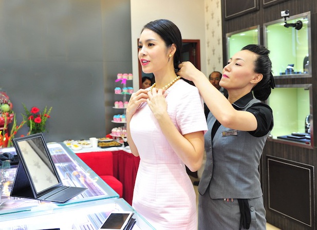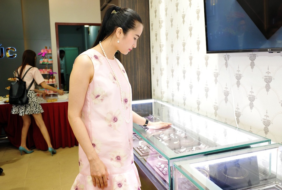 | Vốn thích phụ kiện thời trang nên Dương Cẩm Lynh chọn mua một số sản phẩm được bày bán tại buổi ra mắt. Nhân viên giúp người đẹp ướm nhiều bộ trang sức. |
