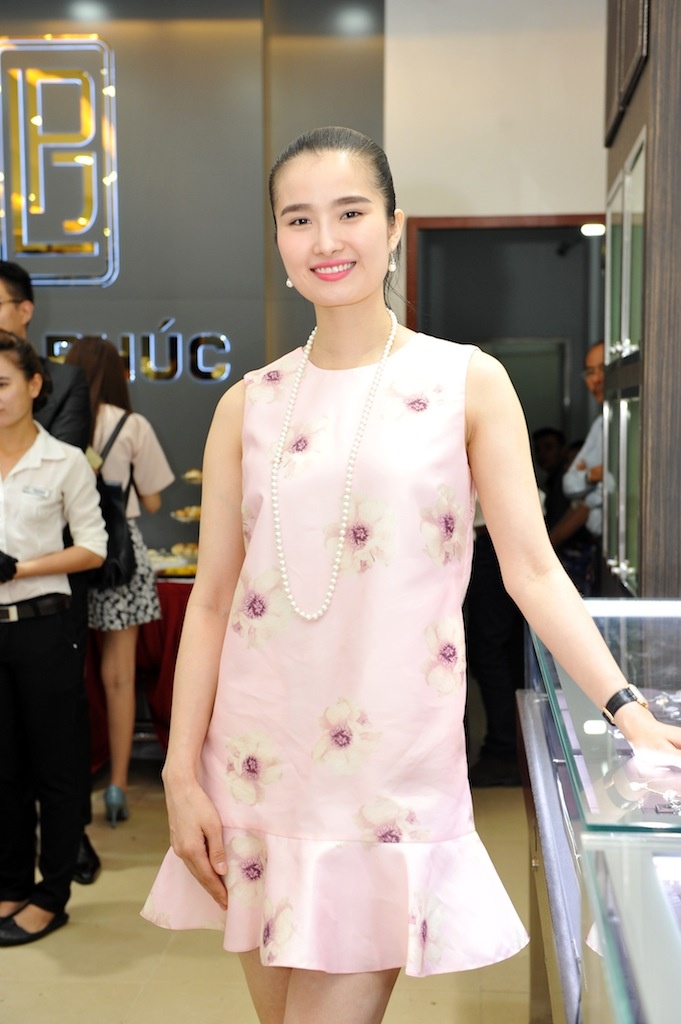 Người đẹp làng phim Việt thích phụ kiện cổ điển đơn giản. Chiếc vòng cổ ngọc trai màu đen khá ăn nhập với bộ váy nhẹ nhàng.