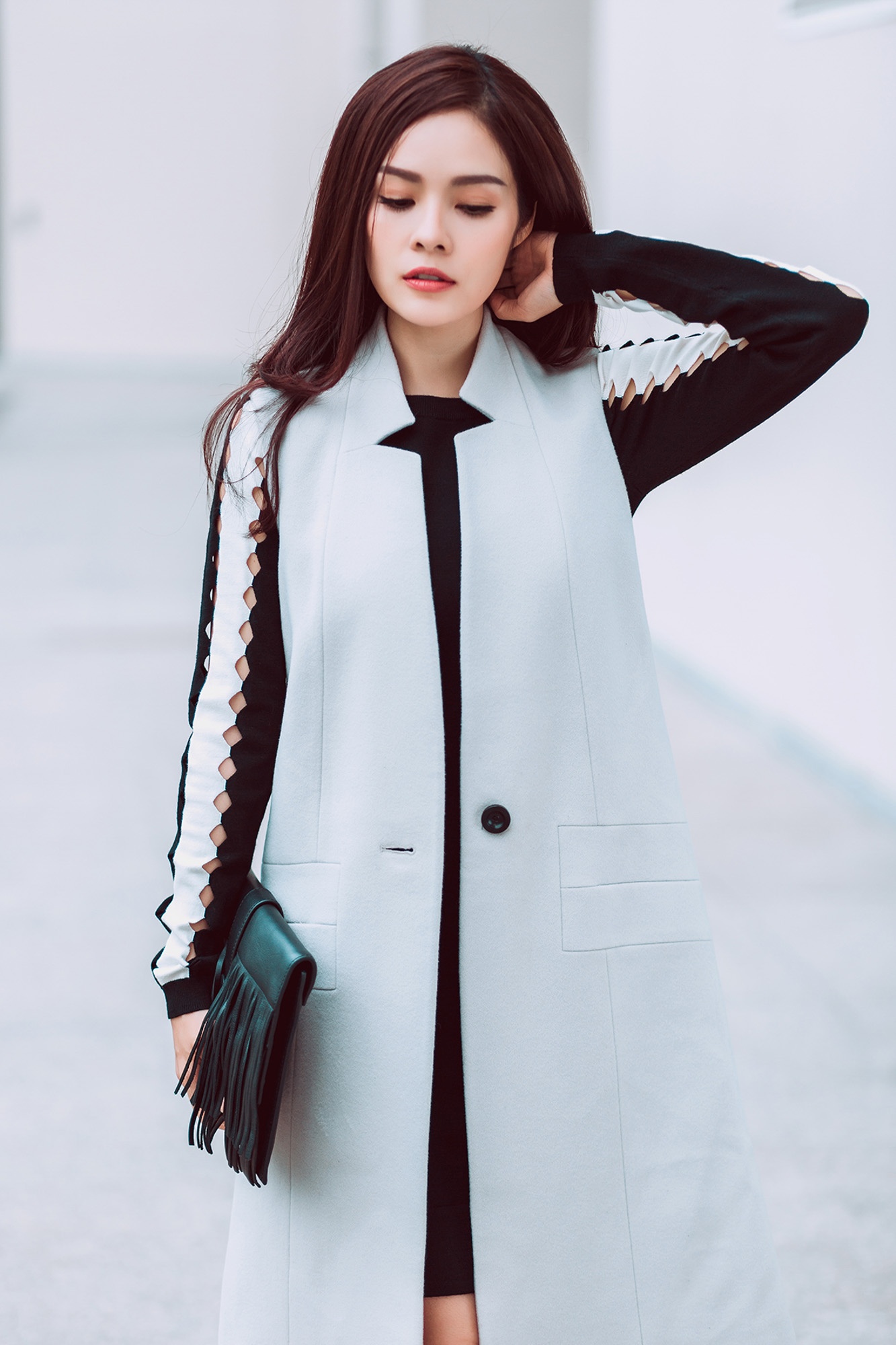 | Lựa chọn xuống phố đầu năm mới, cô chọn chiếc áo khoác dài với thiết kế lạ mắt ở phần cổ và tay áo. |