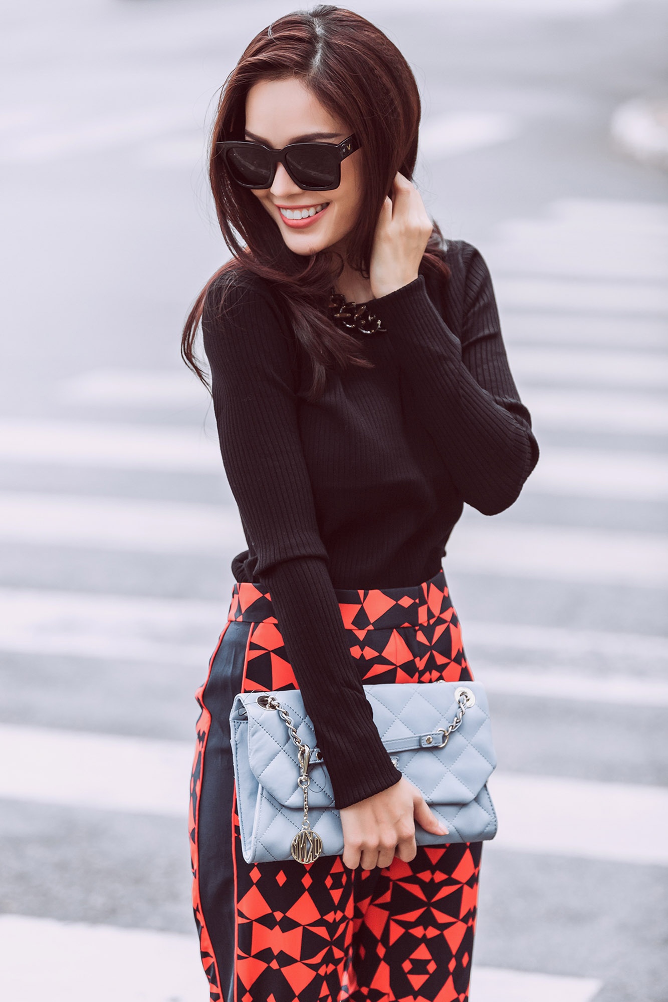 | Nữ diễn viên yêu thích sự thoải mái, tiện lợi khi kết hợp áo len gân tay dài màu đen cùng quần dài họa tiết hình học. |