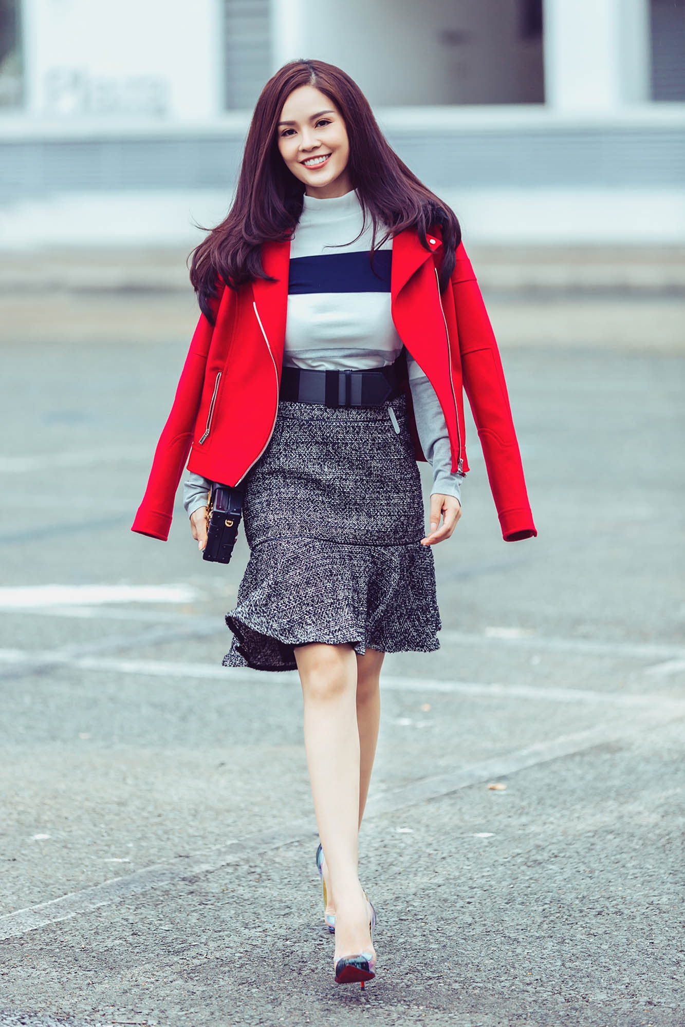 | Dương Cẩm Lynh biến hóa với áo thun tay dài và chân váy đuôi cá, bên ngoài khoác áo jacket đỏ. Set đồ này giúp cô vừa duyên dáng nhưng không kém phần cá tính. |