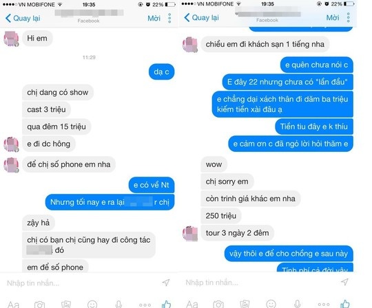Tương tự, H.Q. (quê tỉnh Khánh Hòa) cho biết sau khi đăng tải tấm hình chụp ở biển lên mạng xã hội Facebook đã bị một người lạ nhắn tin, dụ “đi khách” với giá 3 triệu đồng. Nếu đồng ý đi theo tour du lịch 2-3 ngày thì lên đến 15 triệu đồng/lần.