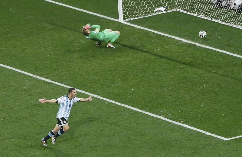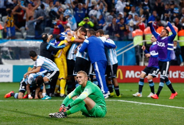 | Nỗi thất vọng của thủ thành Cillessen tương phản với màn ăn mừng của các cầu thủ Argentina. |