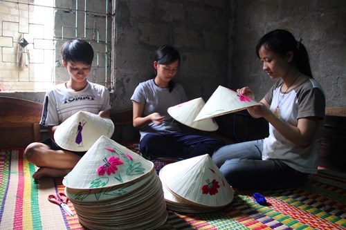 | 3 chị em Huệ, Thanh Và Thiên đang miệt mài thêu nón lá để phụ giúp mẹ kiếm tiền để nhập học. |