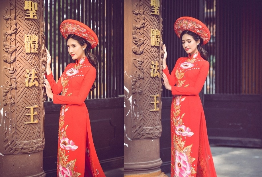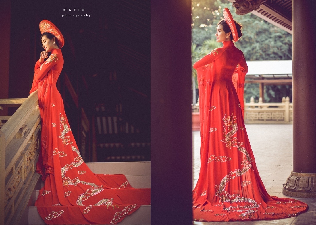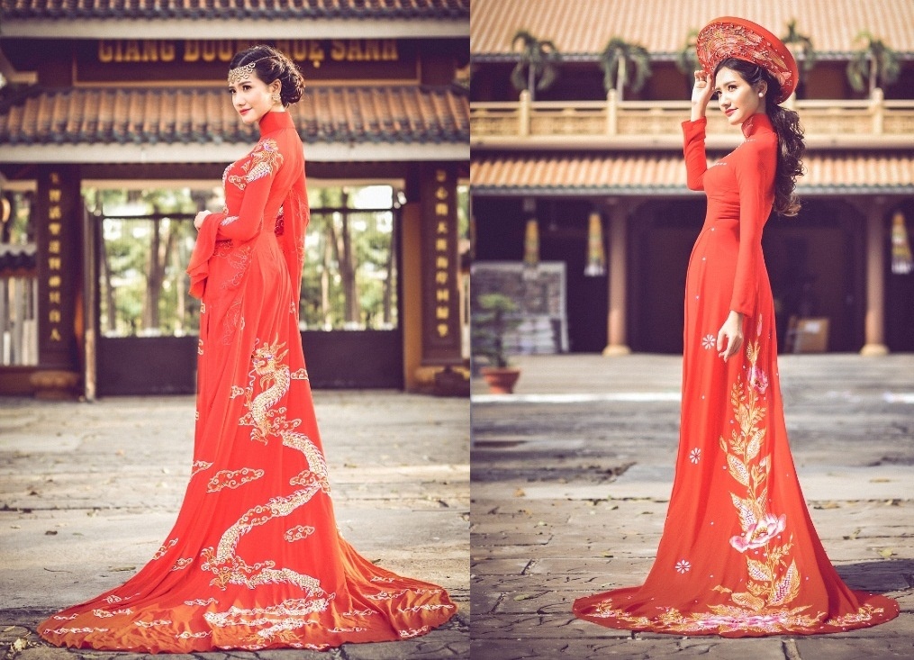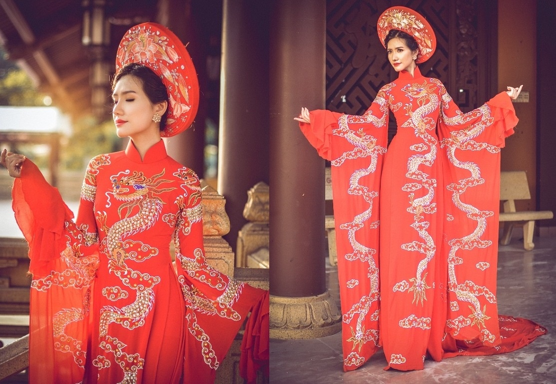 | Chiếc áo dài với tông màu đỏ chủ đạo được chạm trổ hình ảnh rồng bay đầy tinh xảo, tượng trưng cho một năm mới thịnh vượng. |