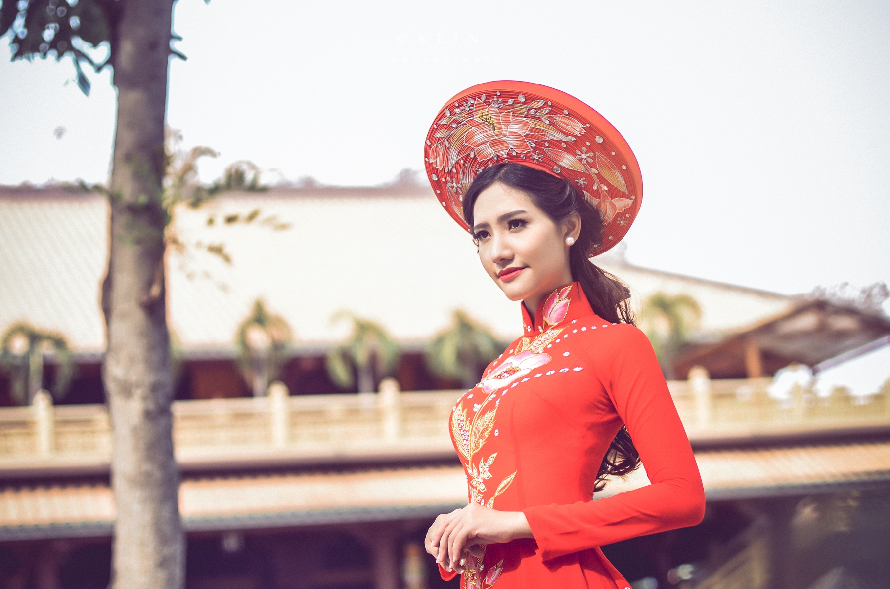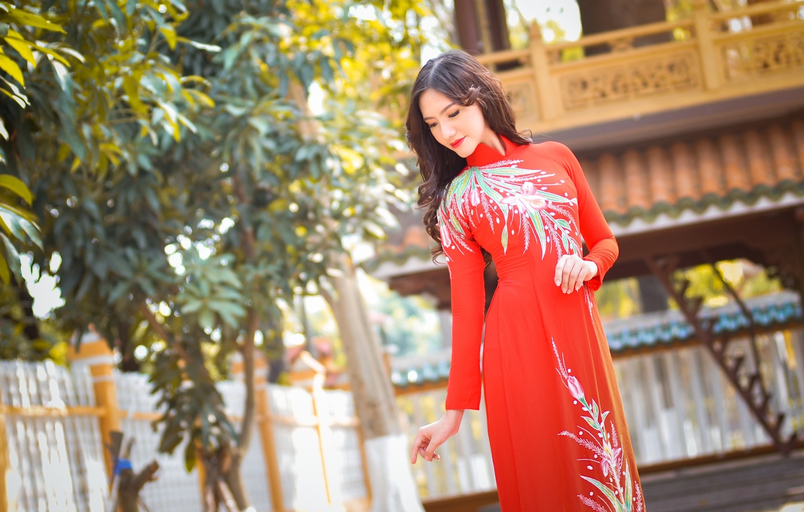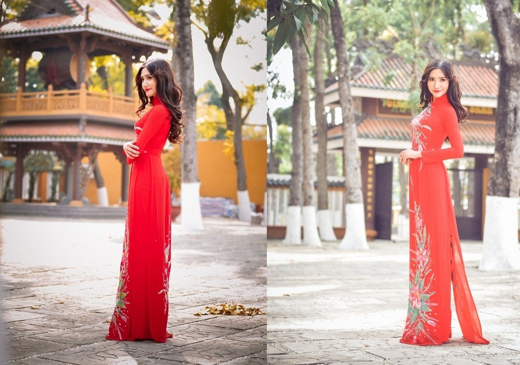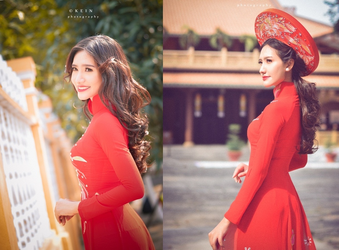 Những nụ tầm xuân nở ra xanh biếc lan tỏa trời xuân. Người thiếu nữ dịu dàng và đằm thắm tận hưởng khí trời dễ chịu của mùa xuân. Với bộ áo dài đầy sắc đỏ này, các cô gái sẽ trở nên nổi bật và cuốn hút hơn khi xuống phố mùa xuân. Nhiếp ảnh: Vinken Skie. Trang điểm: Thiên Kim. Thời trang: NTK Tommy Nguyễn (41, Ngư Hải, TP.Vinh, Nghệ An).