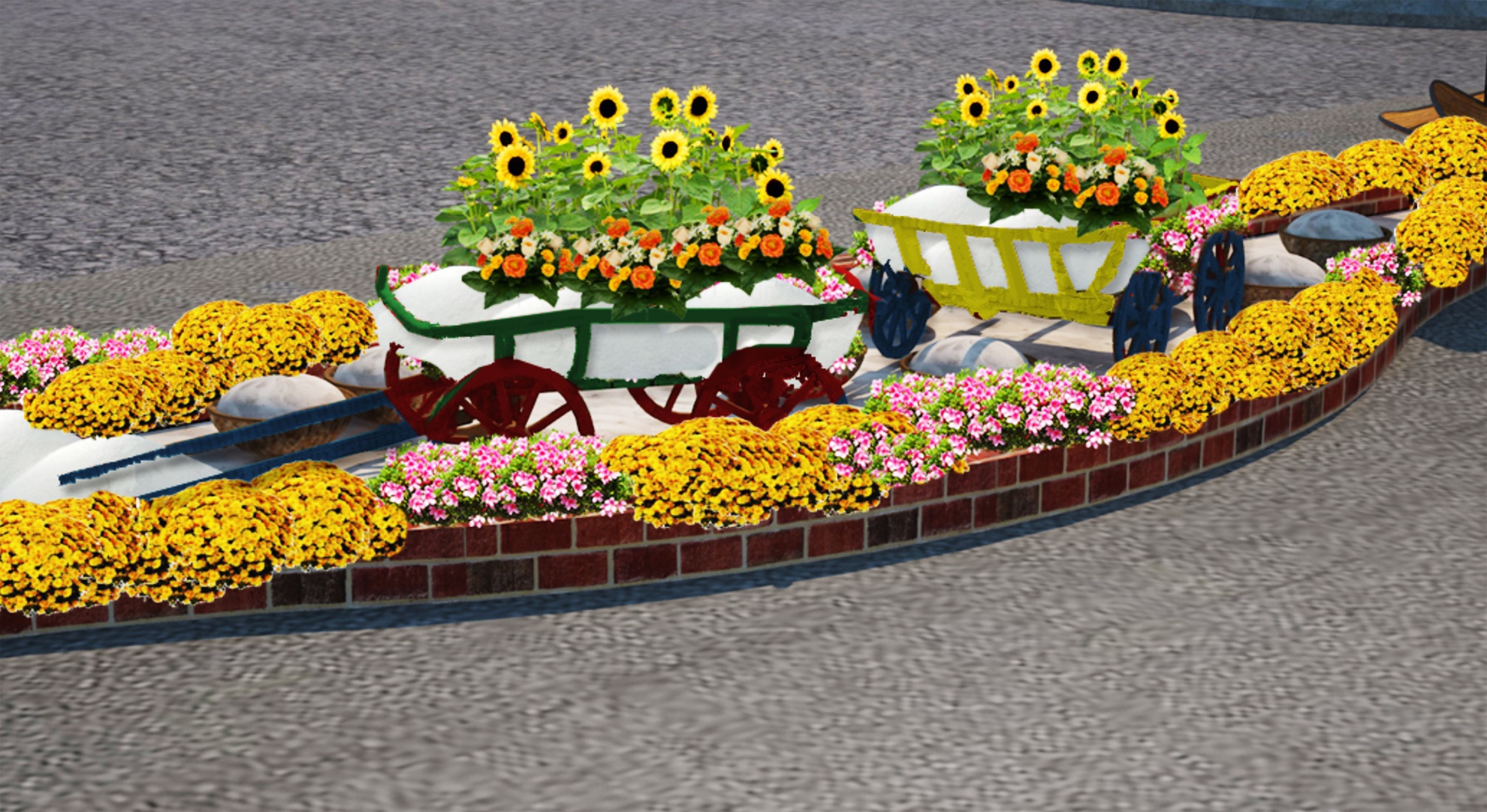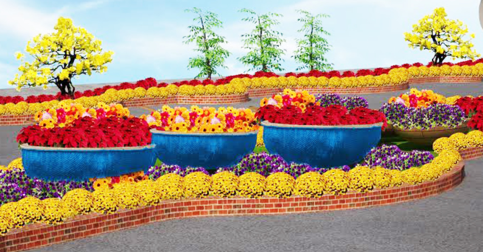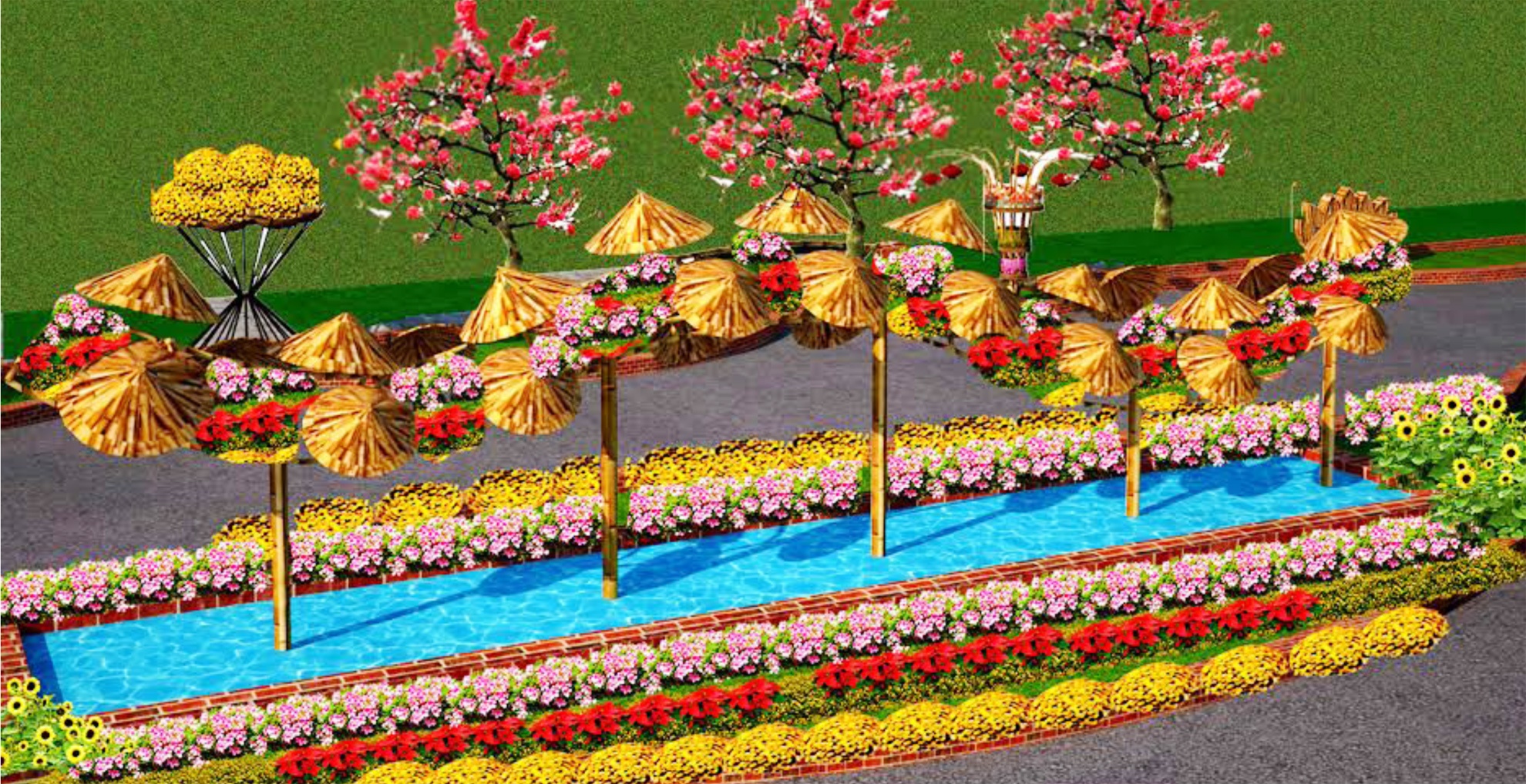 | Phác thảo tiểu cảnh "Xe muối chở vị biển xa" hội tụ nhiều loài hoa rực rỡ sắc màu. |