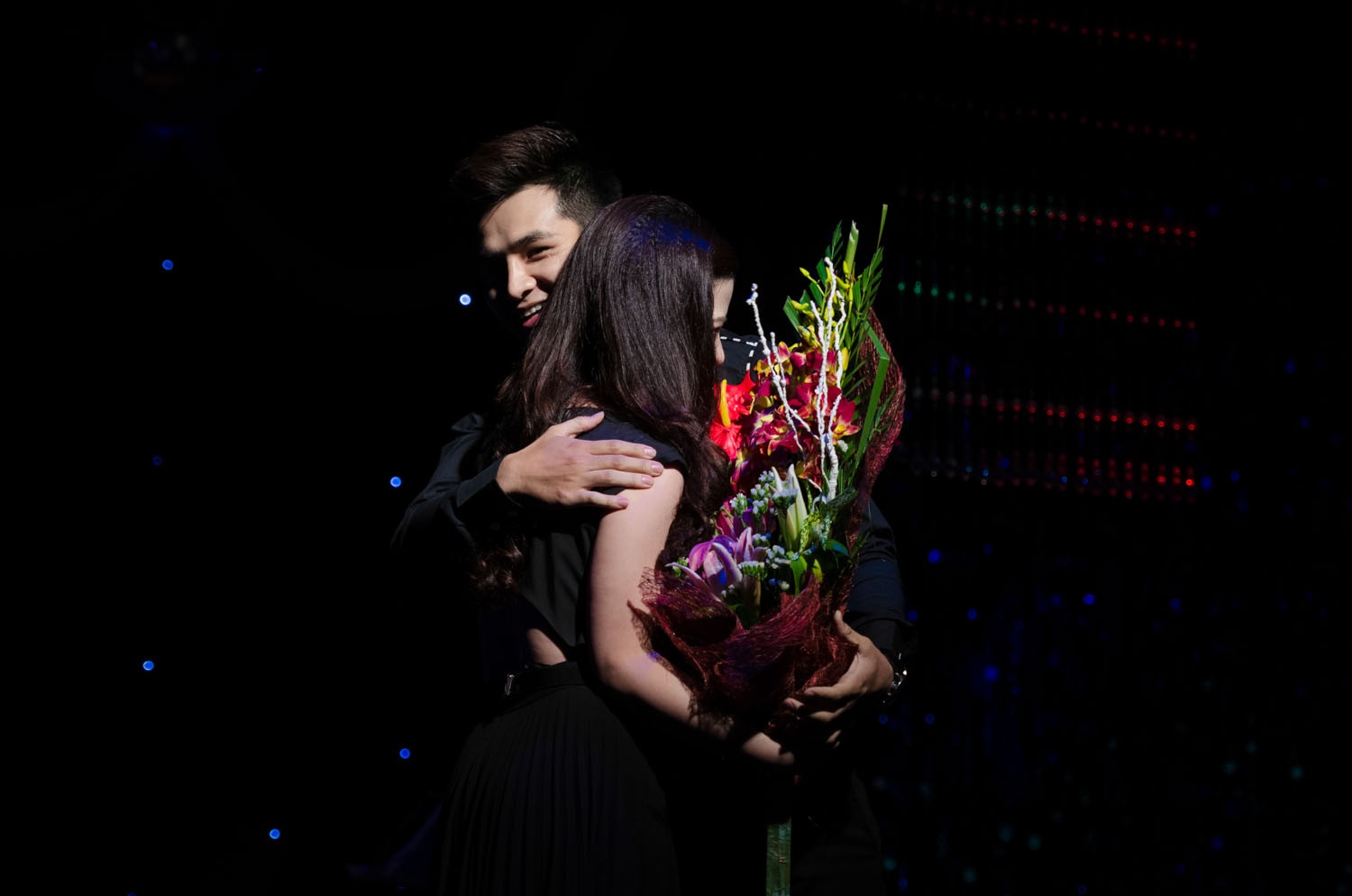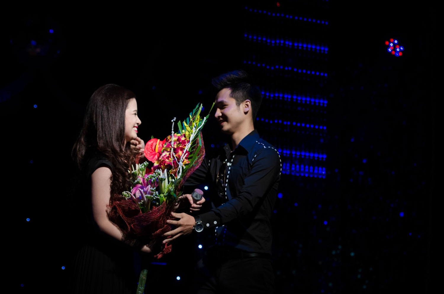| Dương Hoàng Yến ngại ngùng khi được người yêu lên sân khấu tặng hoa và ôm chặt. Trong MV lần này của cô, Hà Anh đóng vai nam chính. Dương Hoàng Yến thổ lộ, trước khi quay MV, cô và bạn trai giận nhau. Chính sự bực tức trong lòng đã giúp Yến nhập tâm hơn vào phân đoạn bùng nổ của nhân vật nữ chính. |