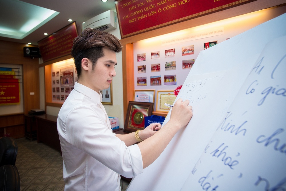 | Hà Anh ghi lời chúc mừng kỷ niệm thành lập trường cũ và Ngày Nhà giáo Việt Nam trên tấm bảng chung. |