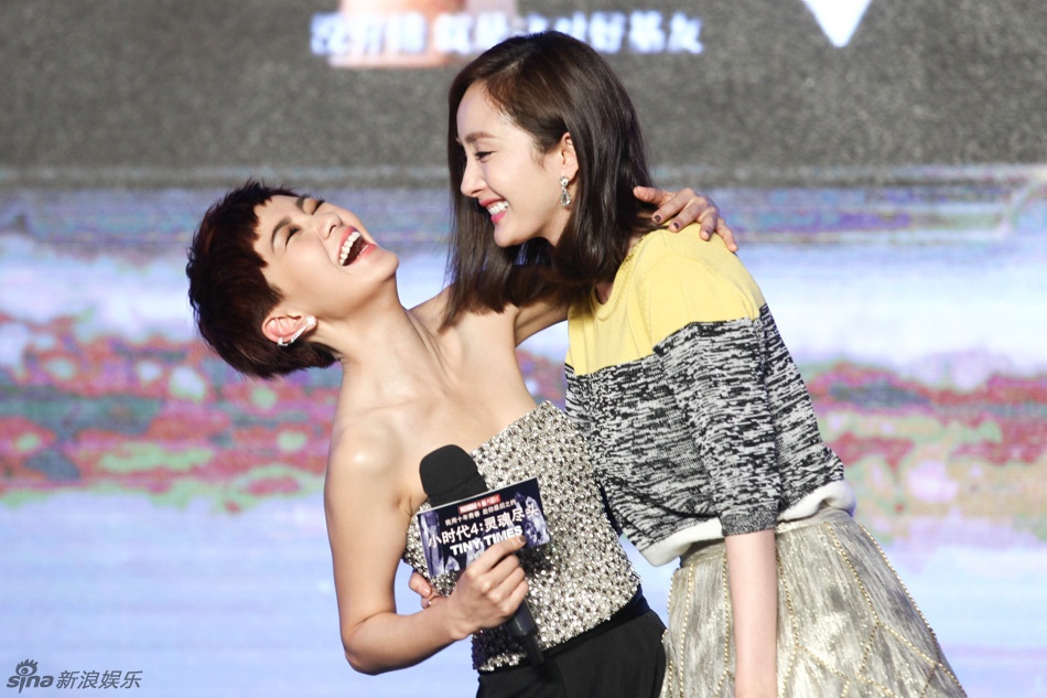 | Cặp đôi mỹ nữ Dương Mịch và Quách Thái Khiết gây sốc khi tái hiện cảnh hôn trong phim ngay trên sân khấu. |