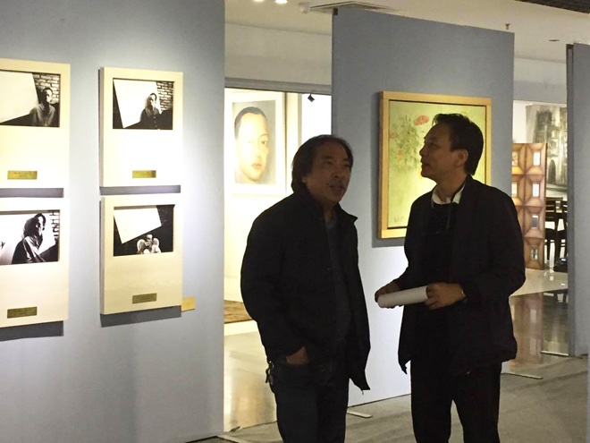 ảnh gia Dương Minh Long trò chuyện với nhà thơ Nguyễn Quang Thiều tại triển lãm Khói trời mênh mông về cố nhạc sĩ Trịnh Công Sơn. |