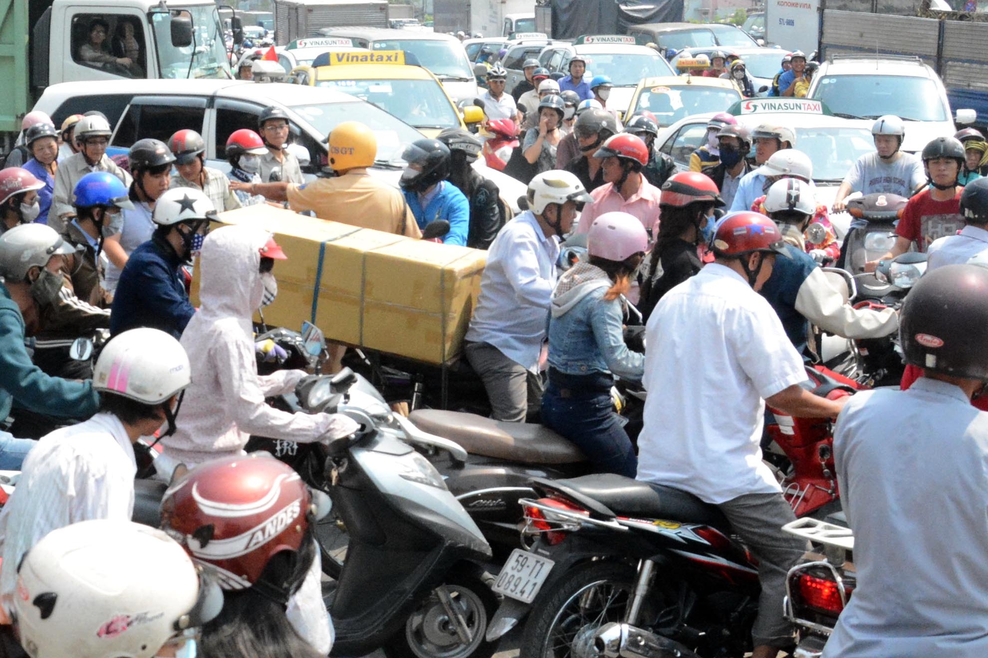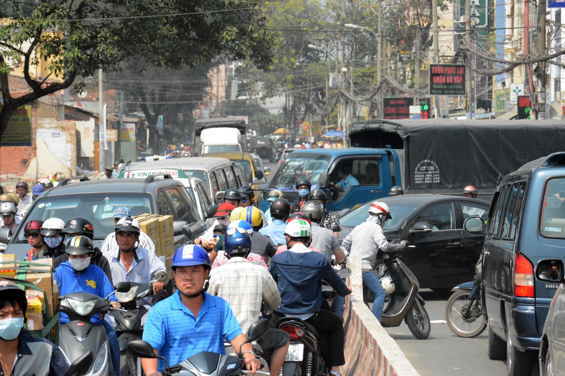 Đường phố TP HCM vào giữa trưa nhưng vẫn đông nghịt, ngả vào Tân Sơn Nhất ùn tắc khiến nhiều người trễ chuyến bay về quê.