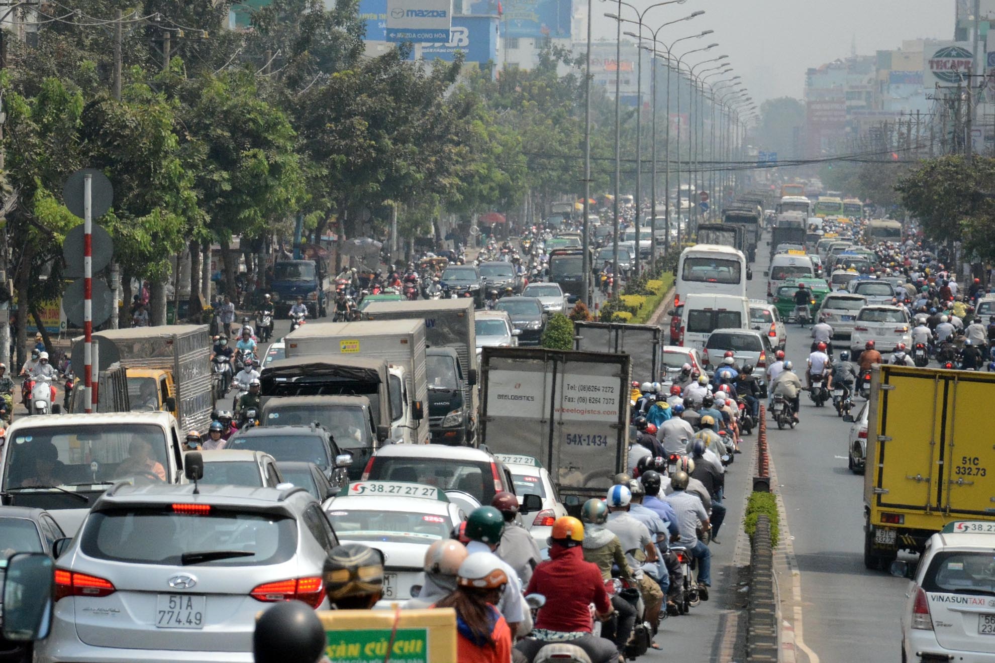 | Các phương tiện lưu thông hướng từ quận Gò Vấp vào sân bay trên đường Nguyễn Kiệm bị "chết đứng" kéo dài hàng cây số. |