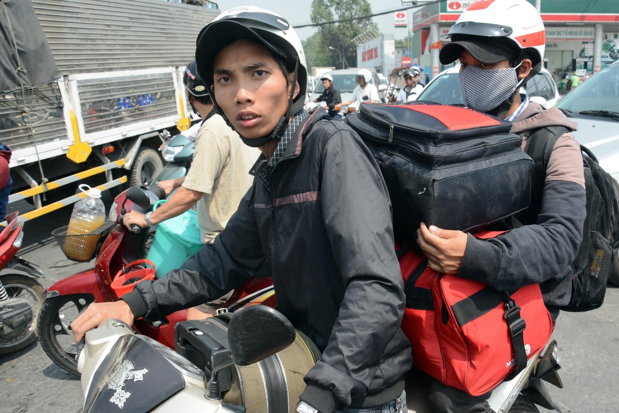 | Hai thanh niên lỉnh kỉnh đồ đạc chạy xe cố vượt qua vòng xoay Nguyễn Kiệm - Nguyễn Thái Sơn để kịp chuyến bay về quê. |