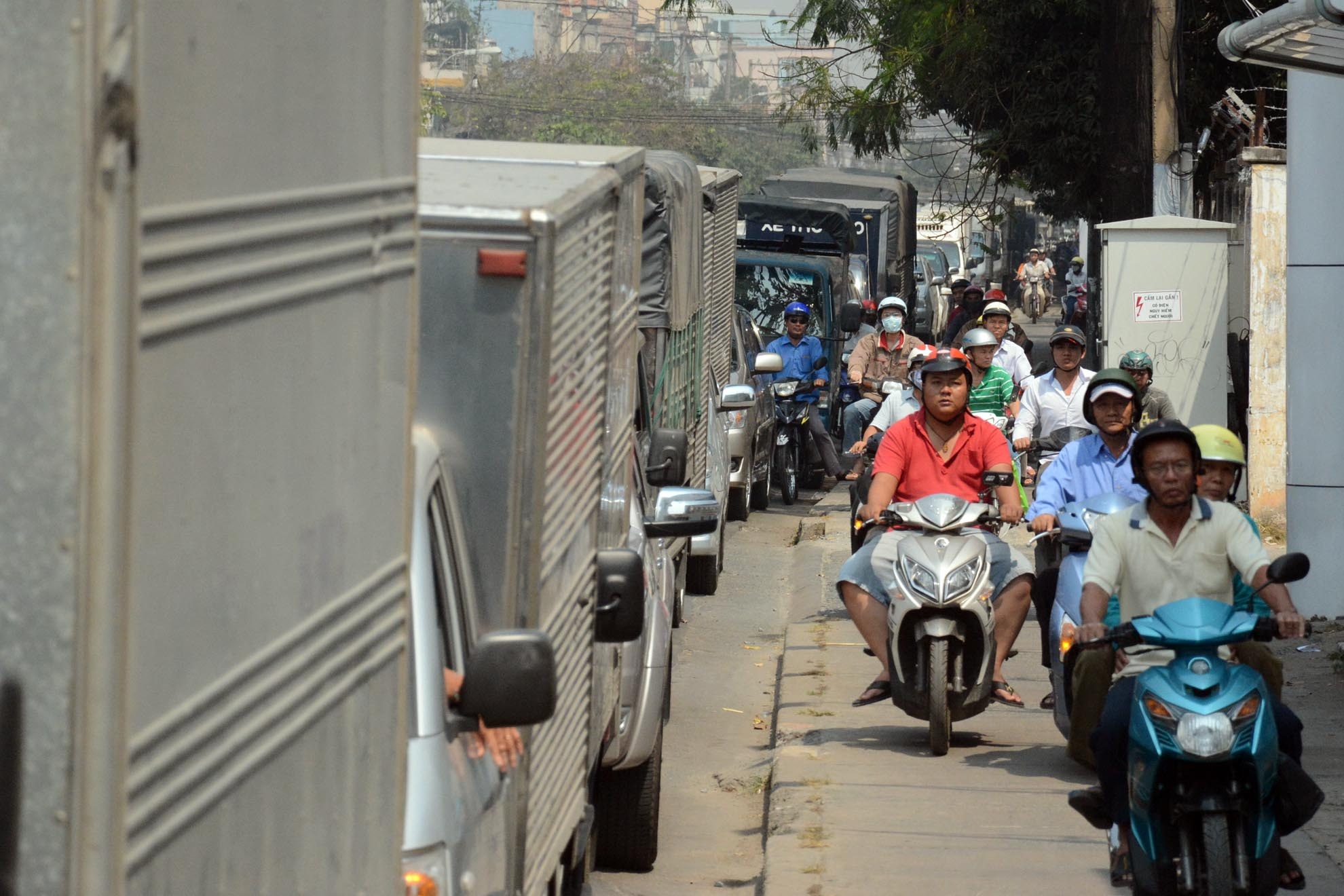 | Nhiều người chạy xe máy lên vỉa hè phía làn đường bên trái dành cho ôtô đang đứng hàng dài trên đường Nguyễn Kiệm. |