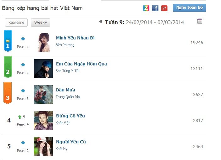 Bảng xếp hạng ca khúc lại giữ nguyên vị trí của Bùi Bích Phương và Sơn Tùng M-TP. Mình yêu nhau đi và Em của ngày hôm qua thay phiên nắm giữ ngôi đầu bảng. Dấu mưa của Trung Quân Idol với hiệu ứng từ bộ phim Quả tim máu cũng giữ được hạng 3. Khắc Việt tăng lên 5 bậc để giữ vị trí thứ 4 cùng ca khúc Đừng cố yêu.