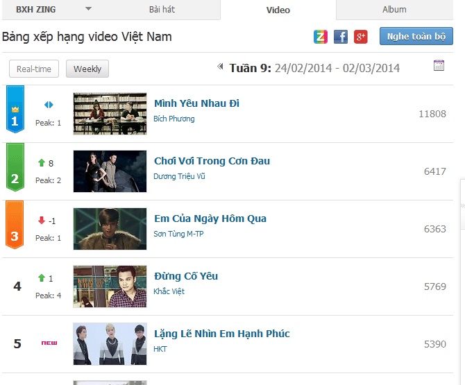 MV Đừng cố yêu của Khắc Việt tăng lên hạng 4 nhưng chưa có dấu hiệu sẽ gây sốt như các sản phẩm trước đó. Nhóm HKT tuần này có MV mới Lặng lẽ nhìn em hạnh phúc nhảy vọt lên vị trí thứ 5. Vệ tinh của Vĩnh Thuyên Kim cũng thăng lên ngôi thứ 6 và Ái Phương – Lưu Quang Anh xuất hiện cùng MV Cần một bờ vai nằm ở vị trí thứ 7. Hồ Quang Hiếu lại tụt xuống hạng 8 với MV Nơi ấy con tim về. Khúc ca tình yêu của Vang Quốc Hải – Hiền Thục vẫn đứng ở hàng 9 trong khi Lâm Chấn Khang chắn giữ vị trí cuối cùng trong top 10 cùng MV Hơn cả nỗi đau.