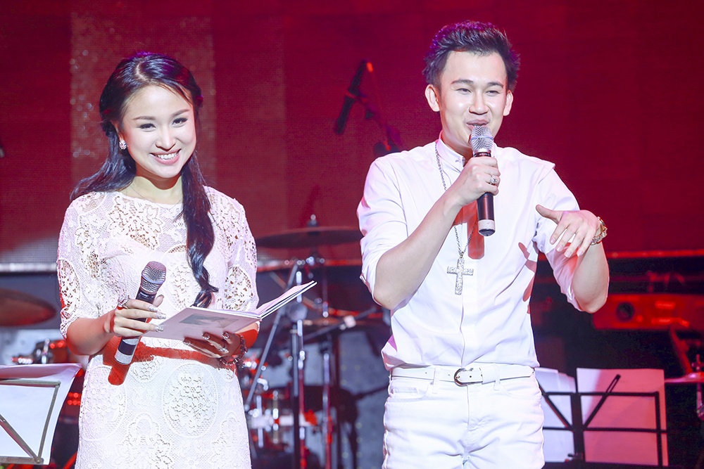 | Vân Hugo làm MC trong buổi họp báo của Dương Triệu Vũ tại Hà Nội. |