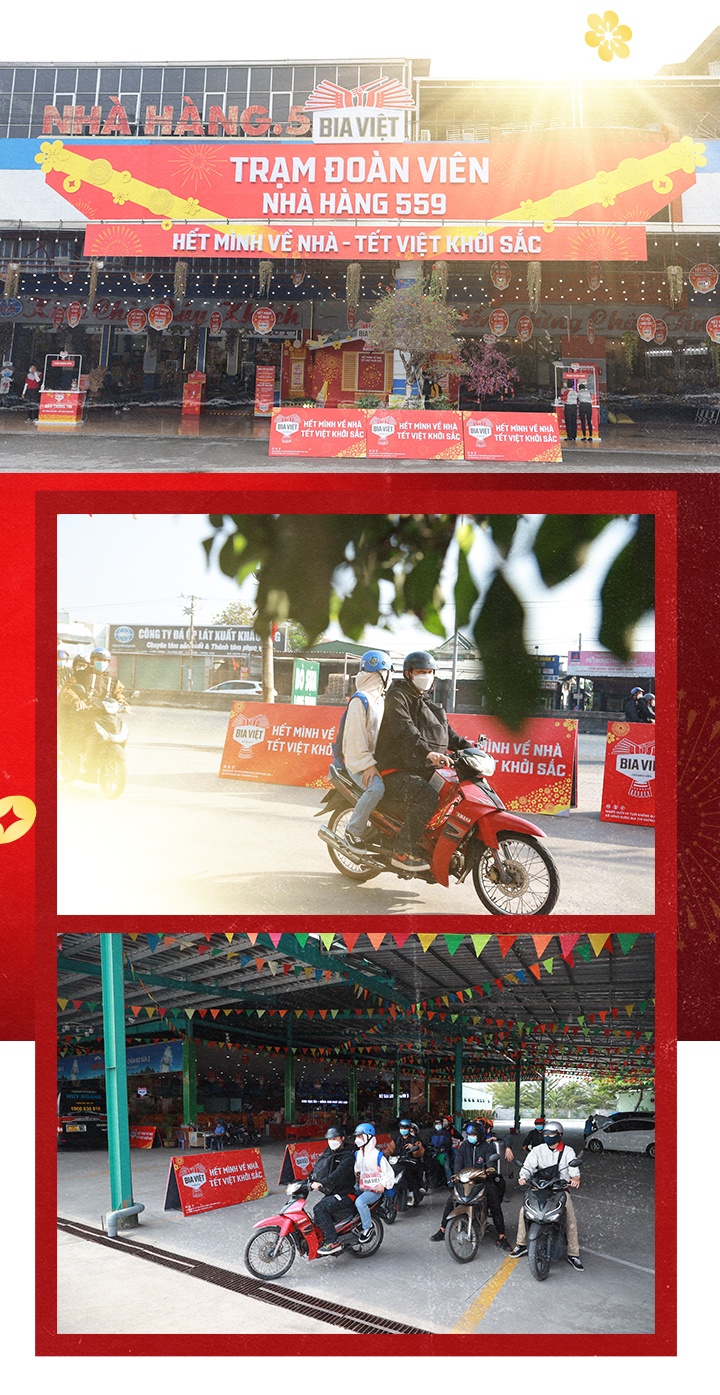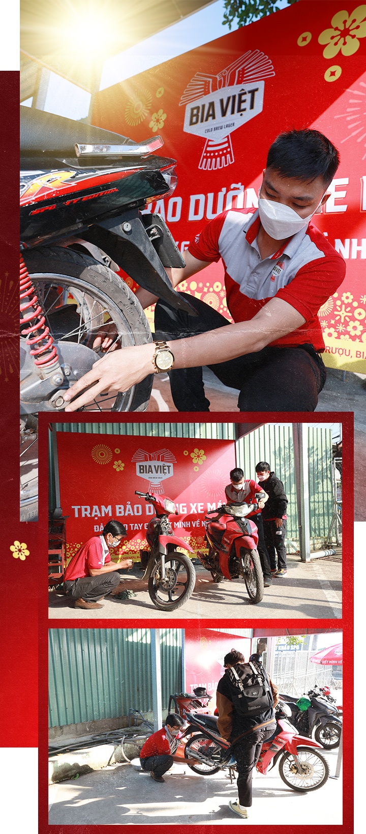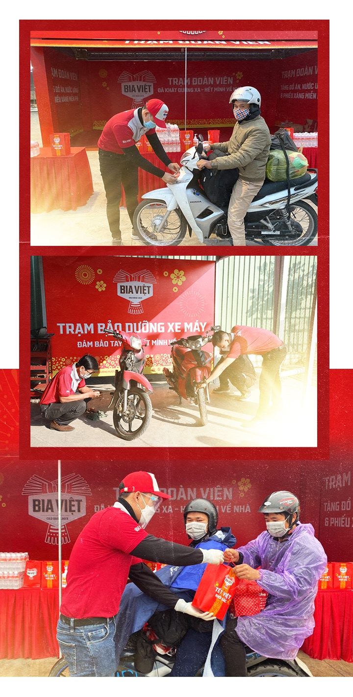 Cùng với bảo dưỡng xe, trạm đoàn viên Bia Việt còn hỗ trợ sinh viên, người lao động phổ thông về quê bằng xe máy hàng nghìn suất ăn, phiếu xăng miễn phí. Không những vậy, trạm còn giúp hành trình về nhà của những người con xa xứ thêm hào hứng bởi nhiều hoạt động giải trí thú vị và trao tặng những phần quà Tết ý nghĩa.