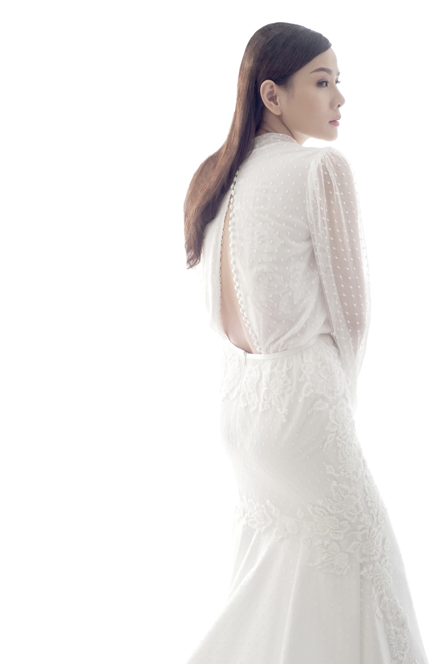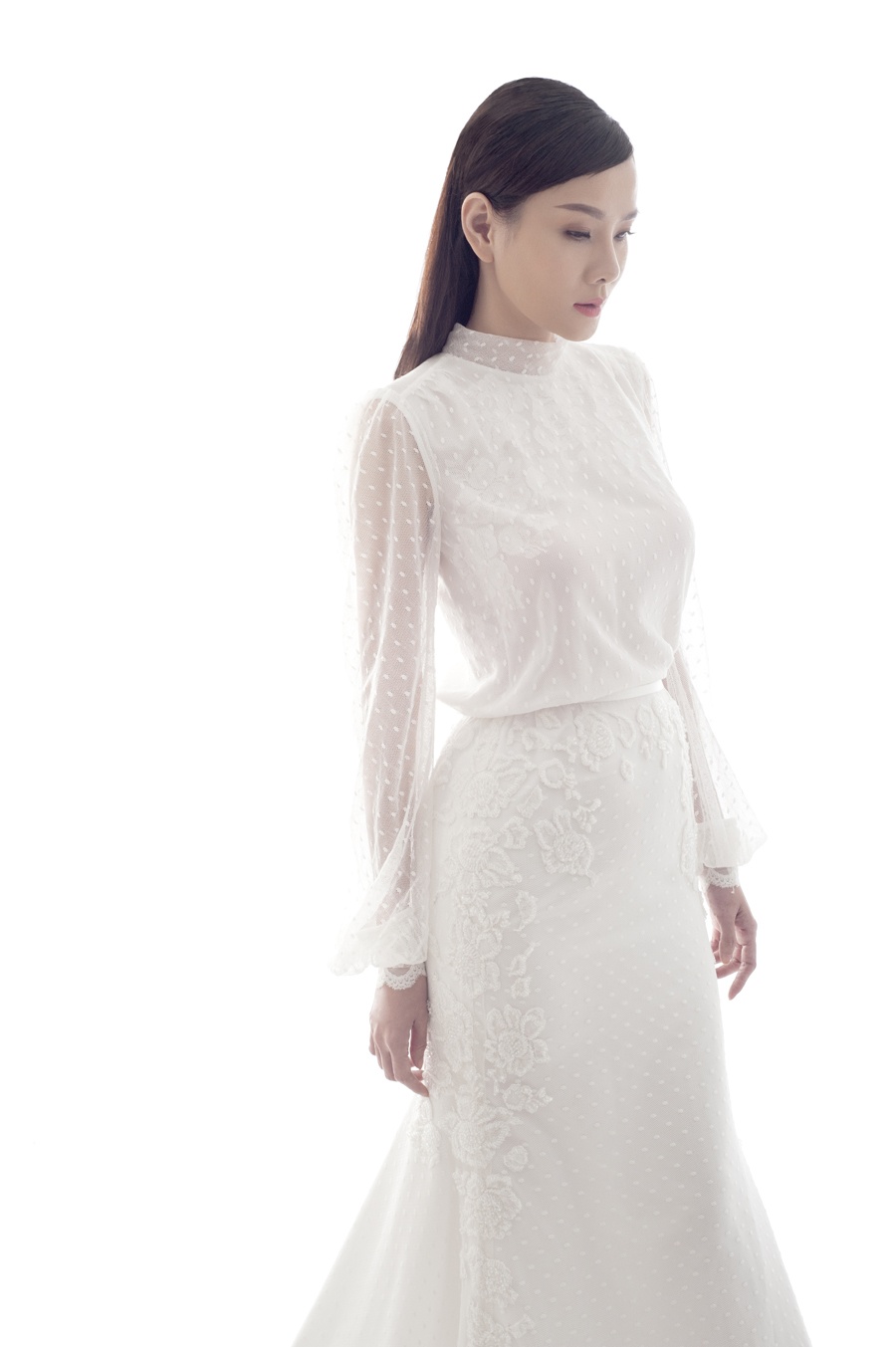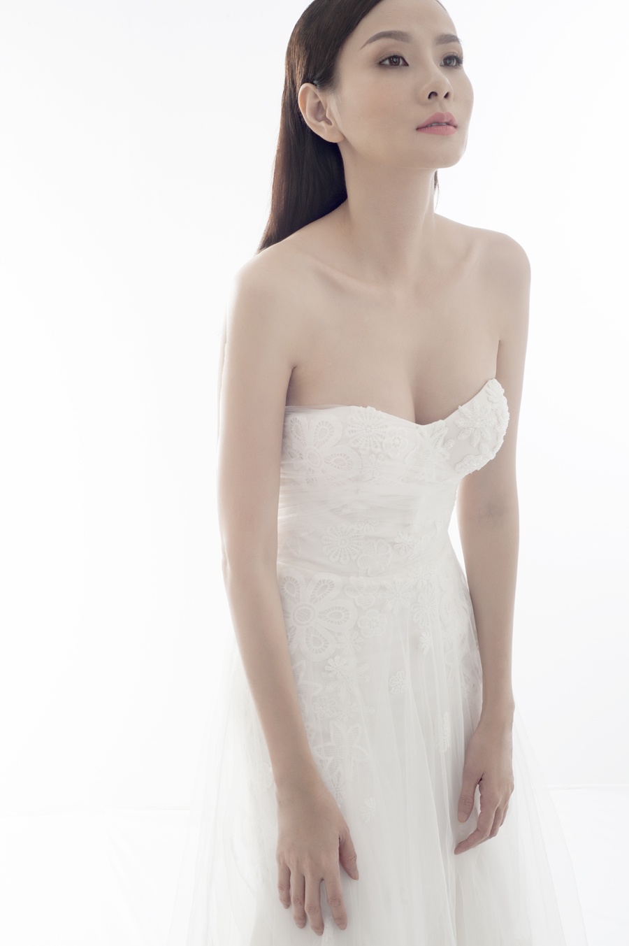 | Bộ sưu tập mới của NTK Trương Thanh Hải giới thiệu mẫu đầm voan ren nhẹ nhàng, tinh khiết được Dương Yến Ngọc thể hiện thành công. |