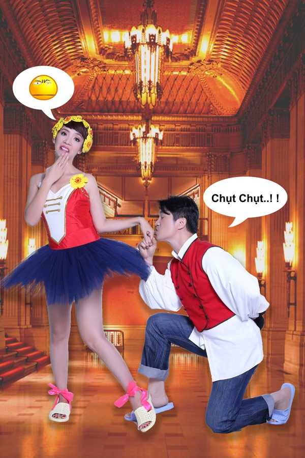 | Để “bù đắp” cho cảnh cơ cực khi diễn vai đôi vợ chồng nghèo trong phim Trúng số, họ đã thực hiện một bộ ảnh hài hước. Ở đó, Dustin Nguyễn là chàng hoàng tử, còn Thu Trang là nàng công chúa Ba lê. |