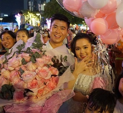 | Tháng 9/2019, cầu thủ Phan Văn Đức và hot girl Võ Nhật Linh công khai hẹn hò. Cuối tháng 12 năm ngoái, đôi trẻ tổ chức lễ ăn hỏi. Theo thông tin của Zing.vn, đôi trẻ sẽ chính thức về chung một nhà vào ngày mùng 6 Tết Nguyên đán 2020. Ảnh: Instagram NV. |