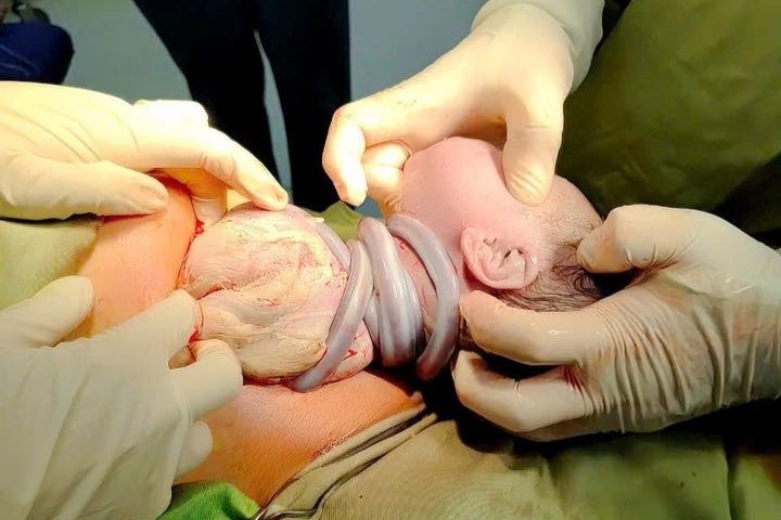 Khi tiến hành mổ lấy thai, ê-kíp phẫu thuật đã phát hiện bé bị 9 vòng dây rốn quấn chặt quanh cổ. Nhận định đây là tình huống rất nguy hiểm, các bác sĩ đã nhanh chóng tháo gỡ và cắt bỏ từng vòng dây rốn để "giải cứu" em bé.