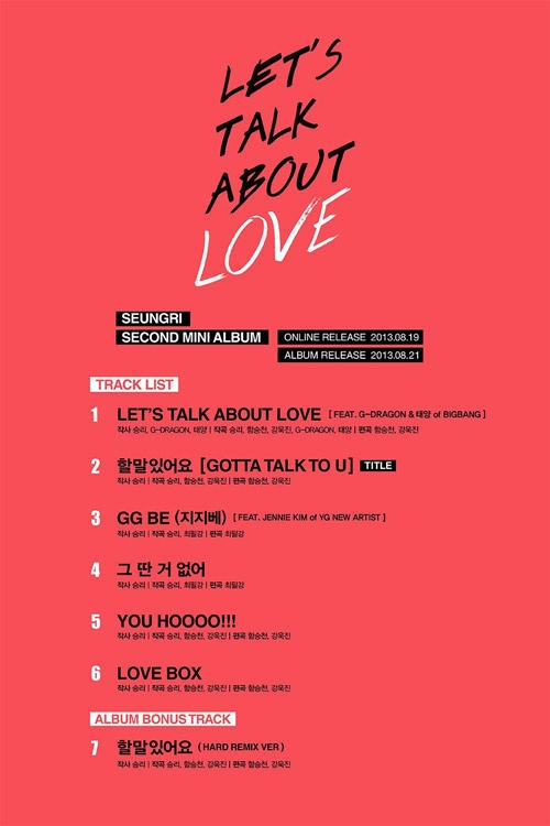 Let's Talk About Love sẽ chính thức ra mắt online vào ngày 19/8 và lên kệ sau đó 2 ngày, 21/8. Nhìn vào danh sách các ca khúc trong album, người hâm mộ có thể trông chờ vào sự kết hợp thú vị giữa Seung Ri với G-Dragon và Jenny Kim.