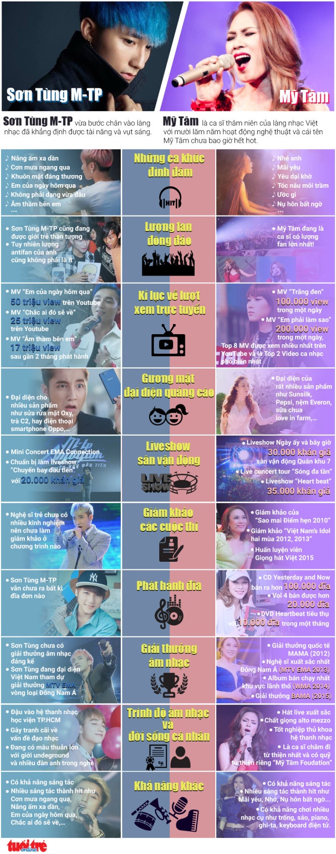| Mỹ Tâm là nghệ sĩ đại diện Đông Nam Á ở giải EMA 2013 còn Sơn Tùng M-TP là nghệ sĩ đại diện Đông Nam Á ở giải EMA 2015. |