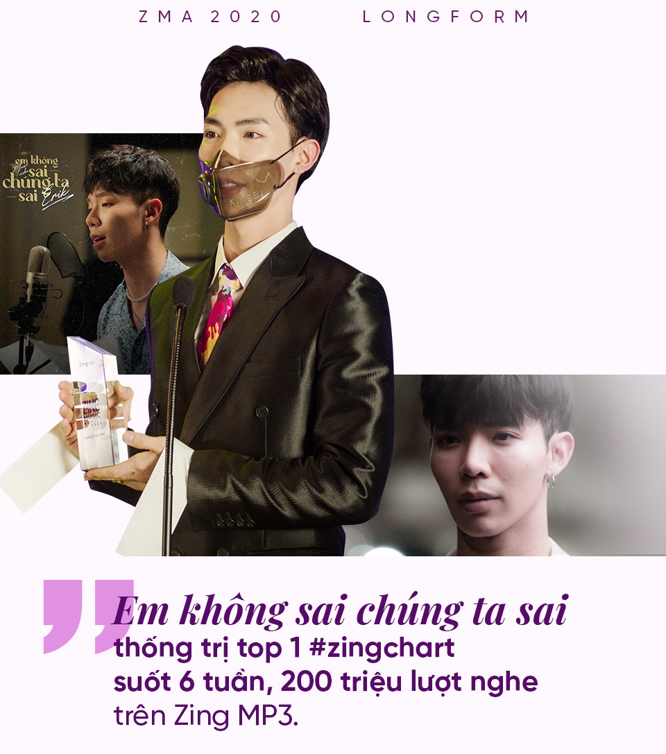 Ngoài ra, các thành viên HĐNT cũng đánh giá cao sức bền trên đường đua Vpop của Erik. Đây cũng chính là điểm độc đáo, giúp anh khác biệt hơn hẳn 4 ứng viên còn lại trong top 5 Nghệ sĩ của năm. Kể từ khoảnh khắc đầu tiên ra mắt với vai trò ca sĩ chính thống cho đến thời điểm hiện tại, Erik thành danh với bề dày loạt hit công phá các vị trí top đầu #zingchart. Đó là những Sau tất cả, Yêu và yêu (2016), Ghen, Lạc nhau có phải muôn đời, Happy ending, Yêu chưa bao giờ là sai, Chưa bao giờ mẹ kể (2017), Chạm đáy nỗi đau, Đừng xin lỗi nữa (2018), Có tất cả nhưng thiếu anh (2019), Em không sai chúng ta sai, Ghen Cô Vy (2020).