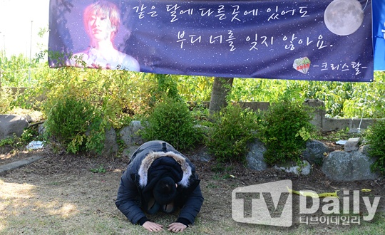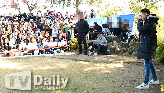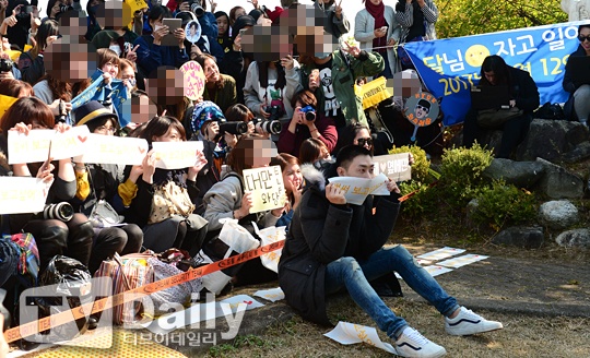 | Hàng trăm fan xếp hàng chờ đợi từ sớm ở phía bên ngoài doanh trại với đầy đủ băng rôn, biểu ngữ để thể hiện tình cảm với thành viên Super Junior. |