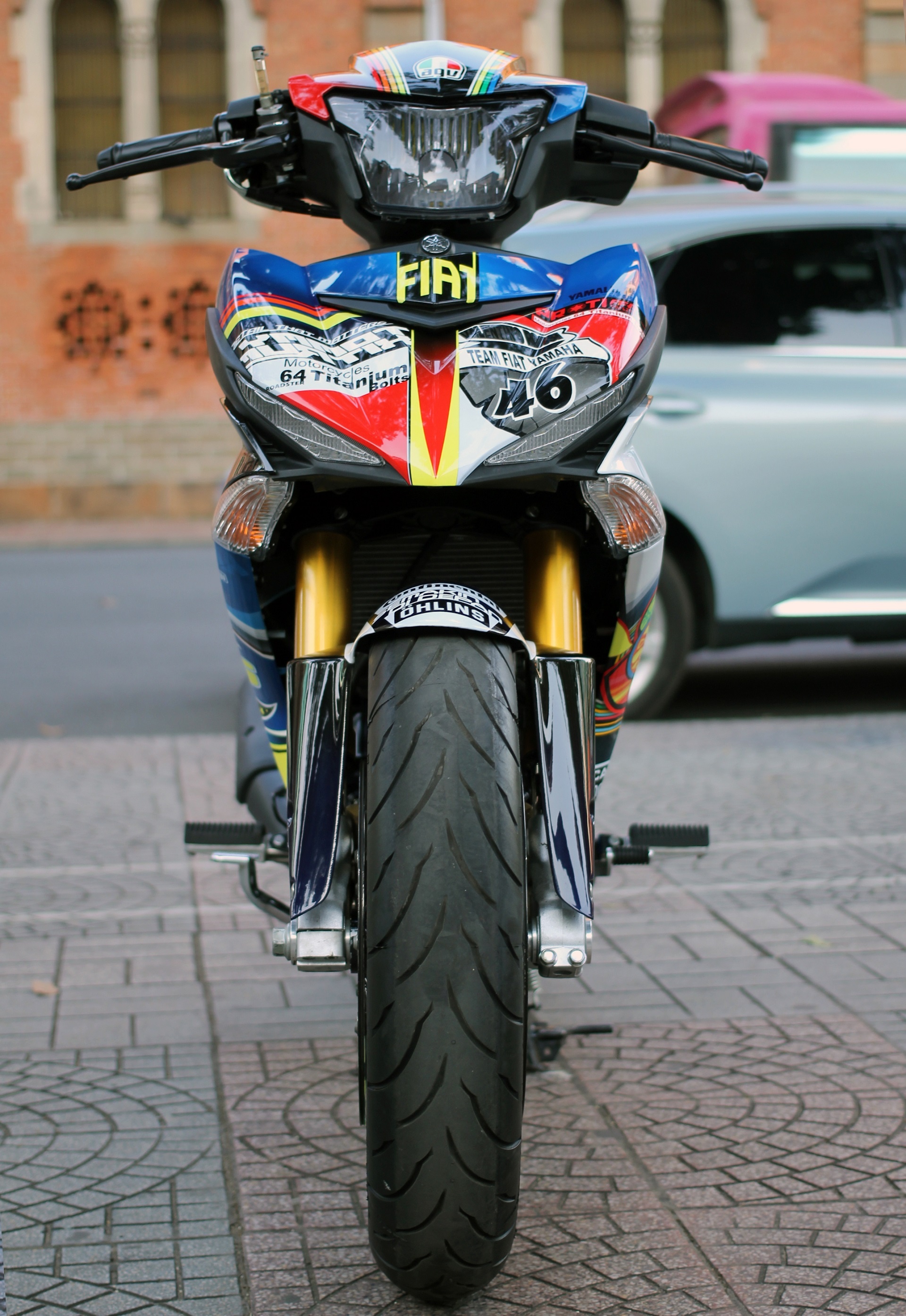| Nhìn từ phía trước, Exciter 150 nổi bật nhờ lốp lớn, chiều rộng lên tới 120 mm. Do sử dụng cặp phuộc dành cho xe phân khối lớn nên góc lái hẹp hơn những chiếc Exciter 150 bình thường. Mặc dù vậy, cặp lốp cho độ bám đường tốt nên không gặp quá nhiều khó khăn khi điều khiển. |