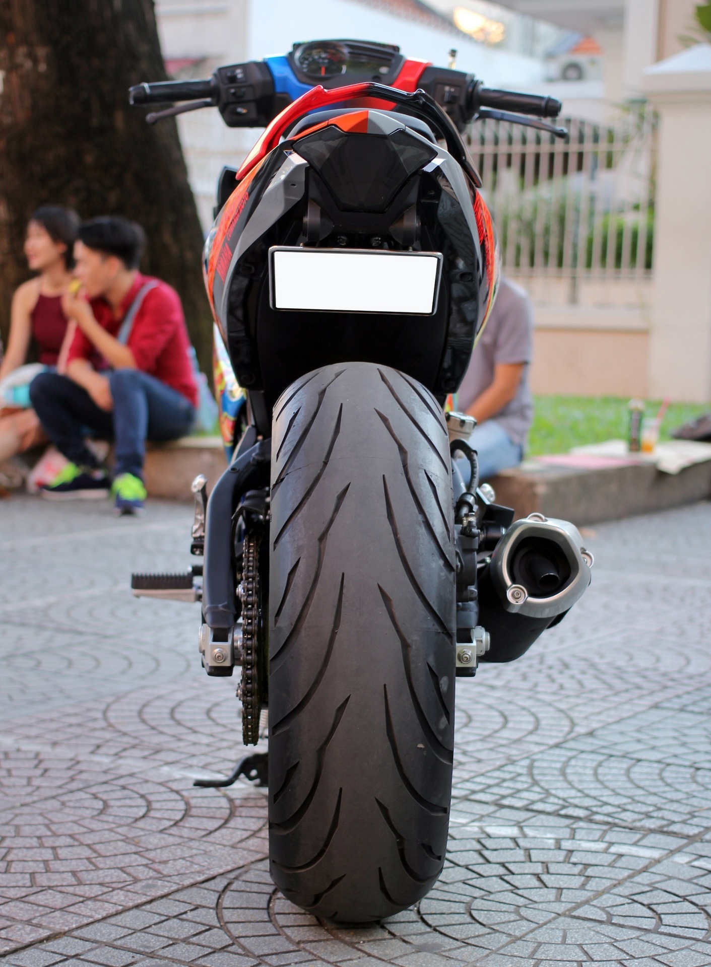 | Phần đuôi được độ lại gọn hơn, vè sau được gỡ bỏ, biển số được gắn vào trong bằng pat nhỏ. Đèn hậu sơn khói khá ngầu. |
