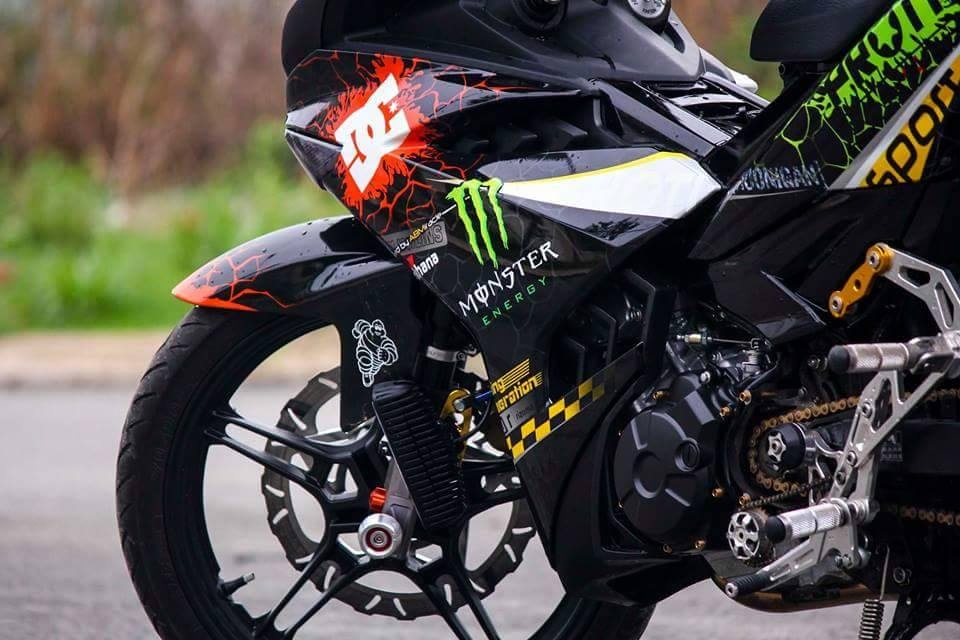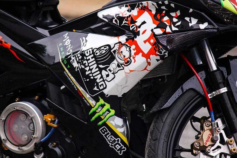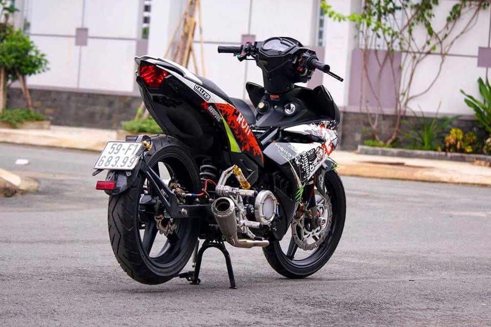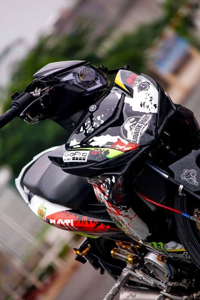 | Exciter 150 nguyên bản màu xanh GP. Để tạo sự khác biệt, chủ nhân của nó độ lại dàn áo với họa tiết lạ mắt bên cạnh loạt đồ chơi hàng hiệu. |