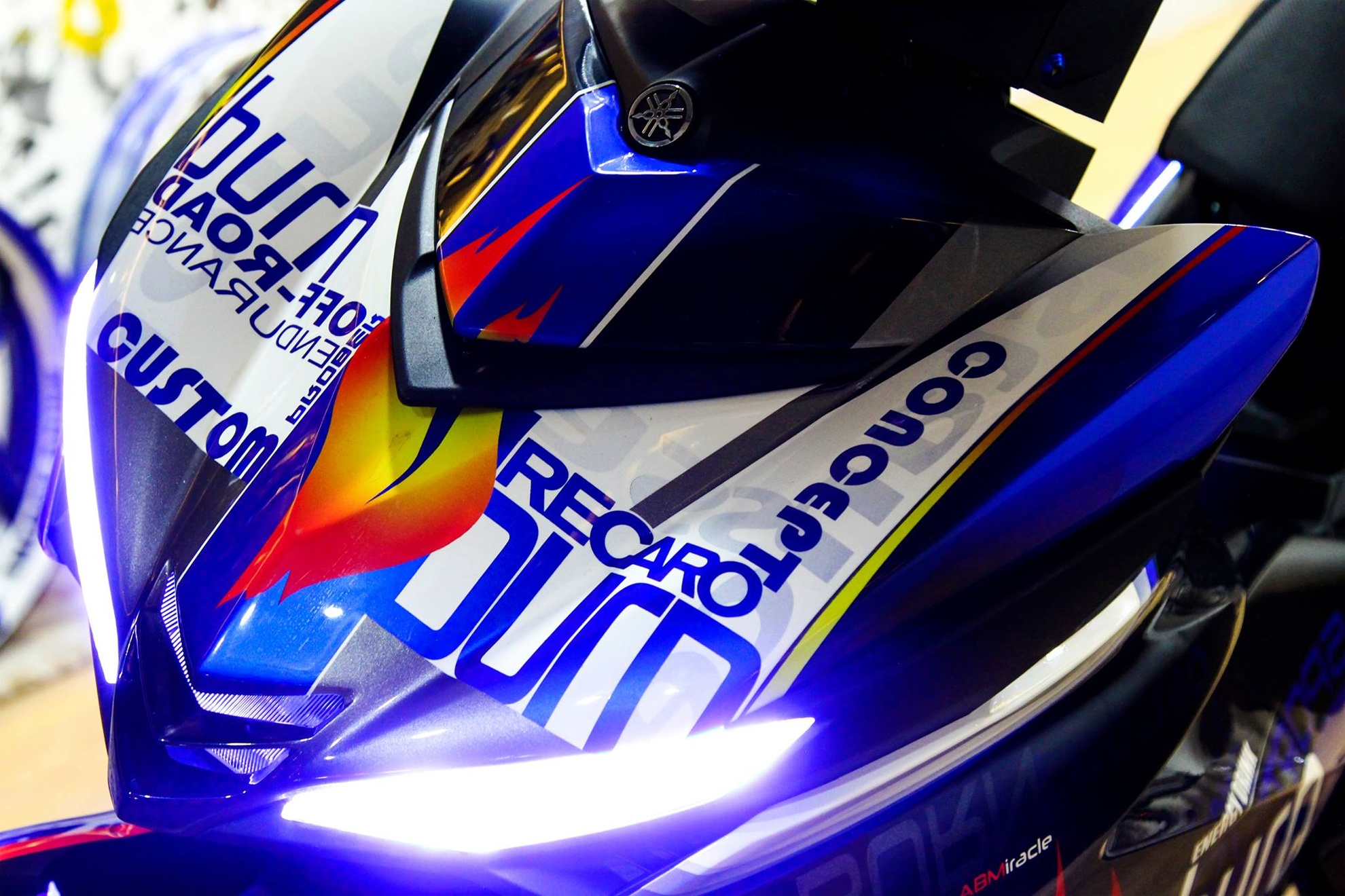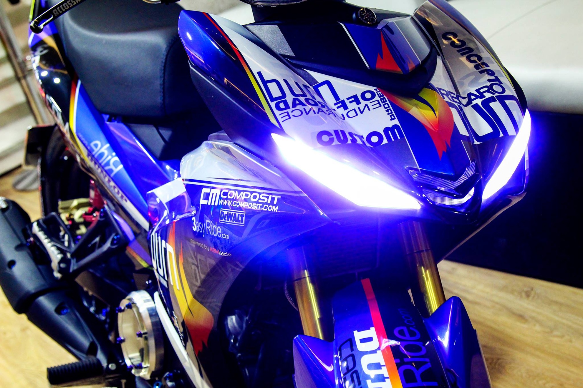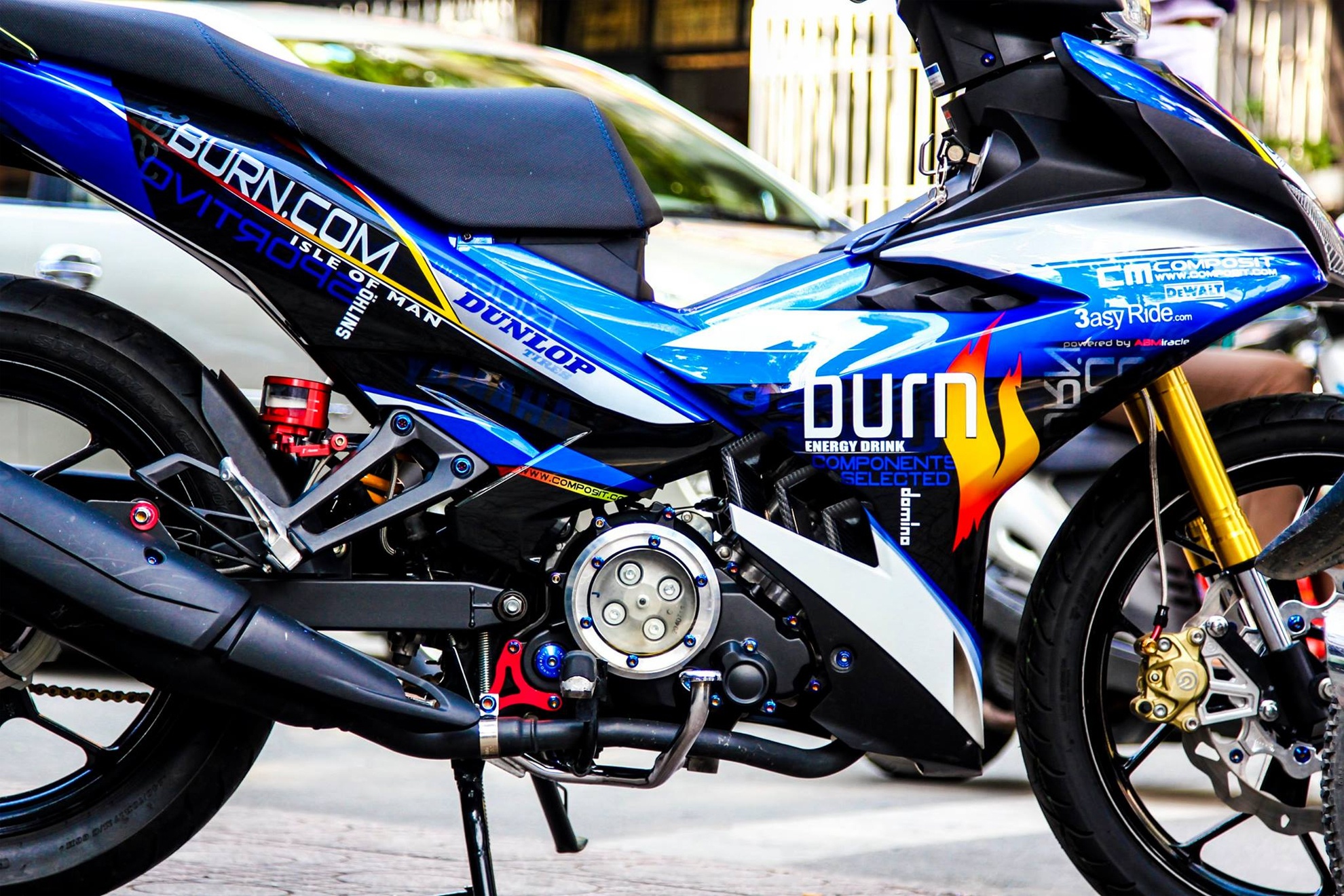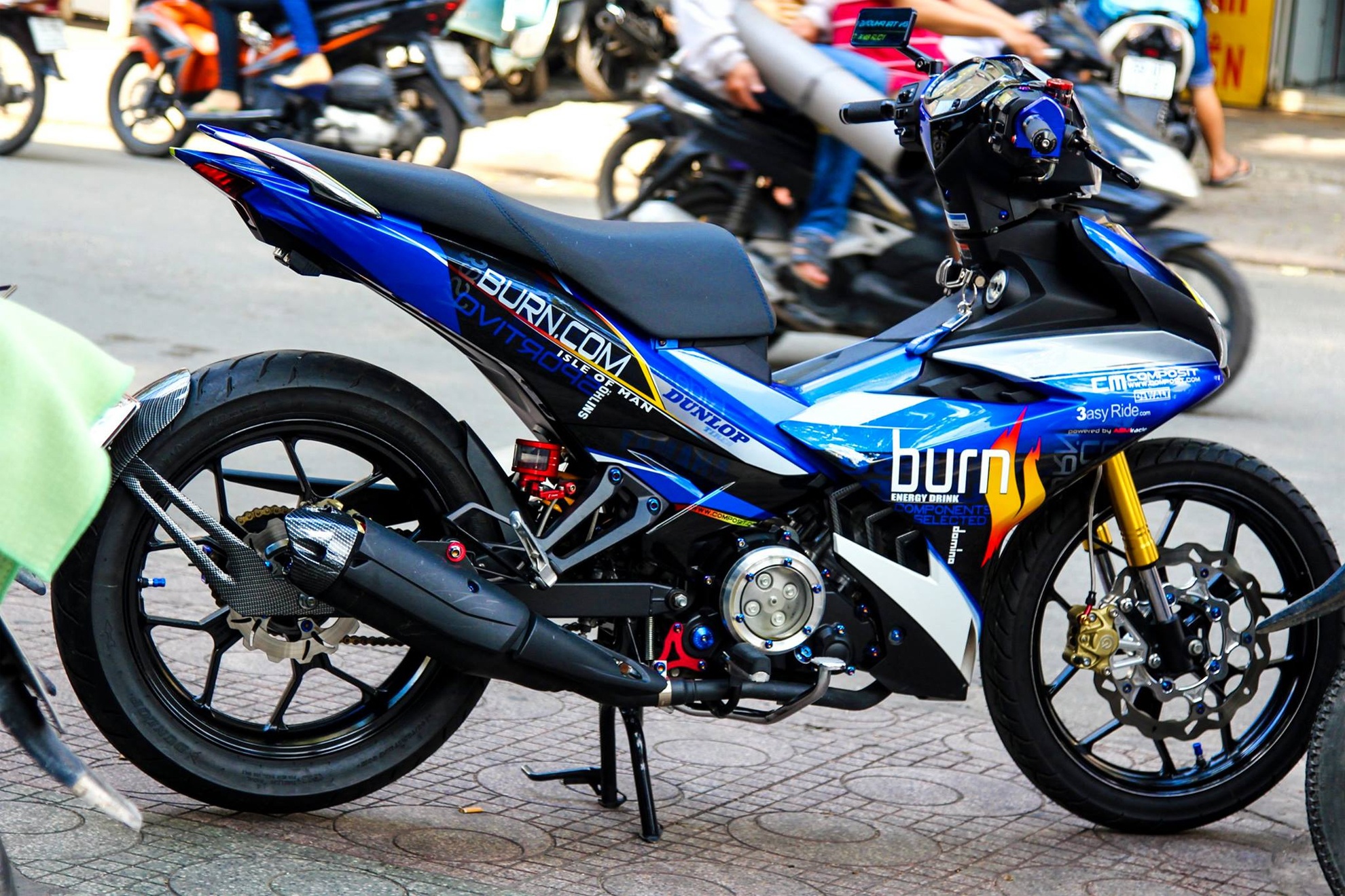 | Bộ nhông sên đĩa vàng tạo điểm nhấn cho dàn chân, lốc máy trong suốt và dàn ốc proti xanh hợp tông với dàn áo, phuộc trước hành trình ngược. Phần dè bảng số thay bằng xi-nhan koso gọn gàng, phía dưới pat chắt bùn T01 carbon chế riêng cho bánh 140, gắn luôn bảng số theo phong cách phân khối lớn. Thời gian hoàn thiện phiên bản độ này là khoảng 10 ngày. |