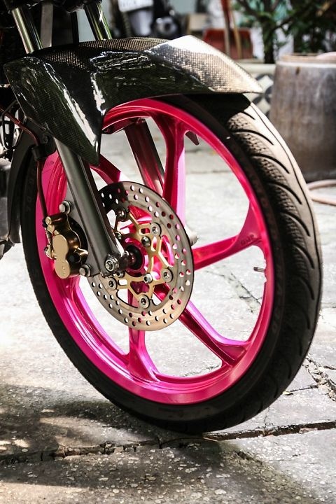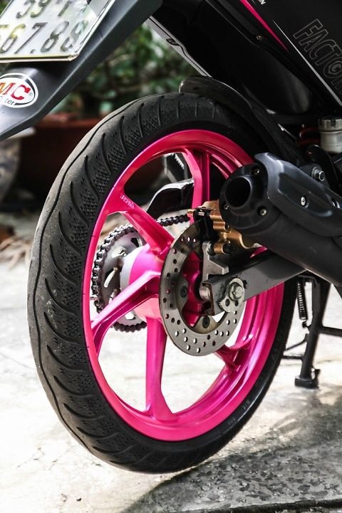 | Vành trước và vành sau của xe đều được sơn màu hồng rất nổi bật. Sự kết hợp hai tông màu đen nhám và hồng mang lại hiệu ứng rất thu hút người nhìn. |