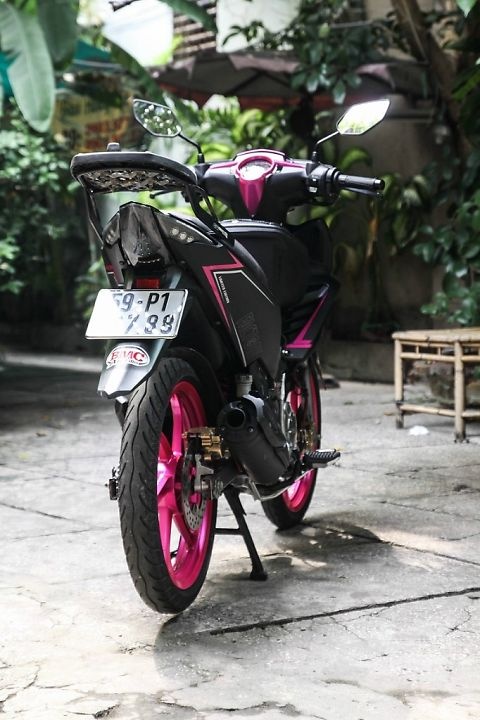 | Chủ nhân của chiếc xe đã loại bỏ bớt dàn vỏ, để hở khối động cơ bên trong. Đồng thời, màu sơn xe cũng được phối lại với hai tông màu đen và hồng rất độc đáo. |