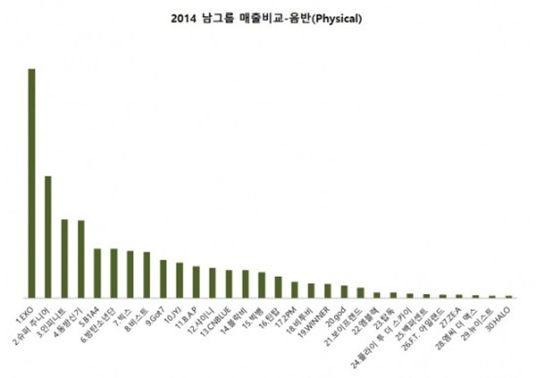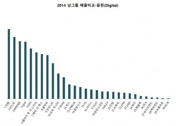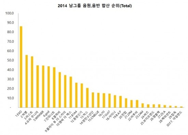 Dựa trên ba yếu tố: Doanh thu các ca khúc kỹ thuật số, doanh số lượng bán album, doanh thu tổng thể, kết quả cũng không khó đoán khi tiền bối - hậu bối, BigBang - EXO đều có tên trong top đầu bảng thống kê này, điều khiến khán giả ngạc nhiên khi hậu bối EXO đã có những bước tiến mạnh mẽ bỏ xa đàn anh BigBang và trở thành "ông hoàng" của năm 2014.