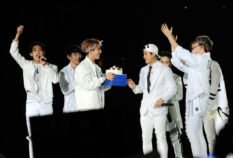 | Sau phần thể hiện, nhóm dành chút ít thời gian để chúc mừng sinh nhật thành viên Jackson. Anh vừa bước sang tuổi 21. Jackson không giấu nổi sự bất ngờ khi được tặng bánh sinh nhật ngay trên sân khấu Hà Nội. |