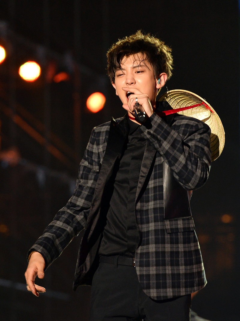| Thành viên EXO đội nón lá fan tặng lên biểu diễn trên sân khấu. |