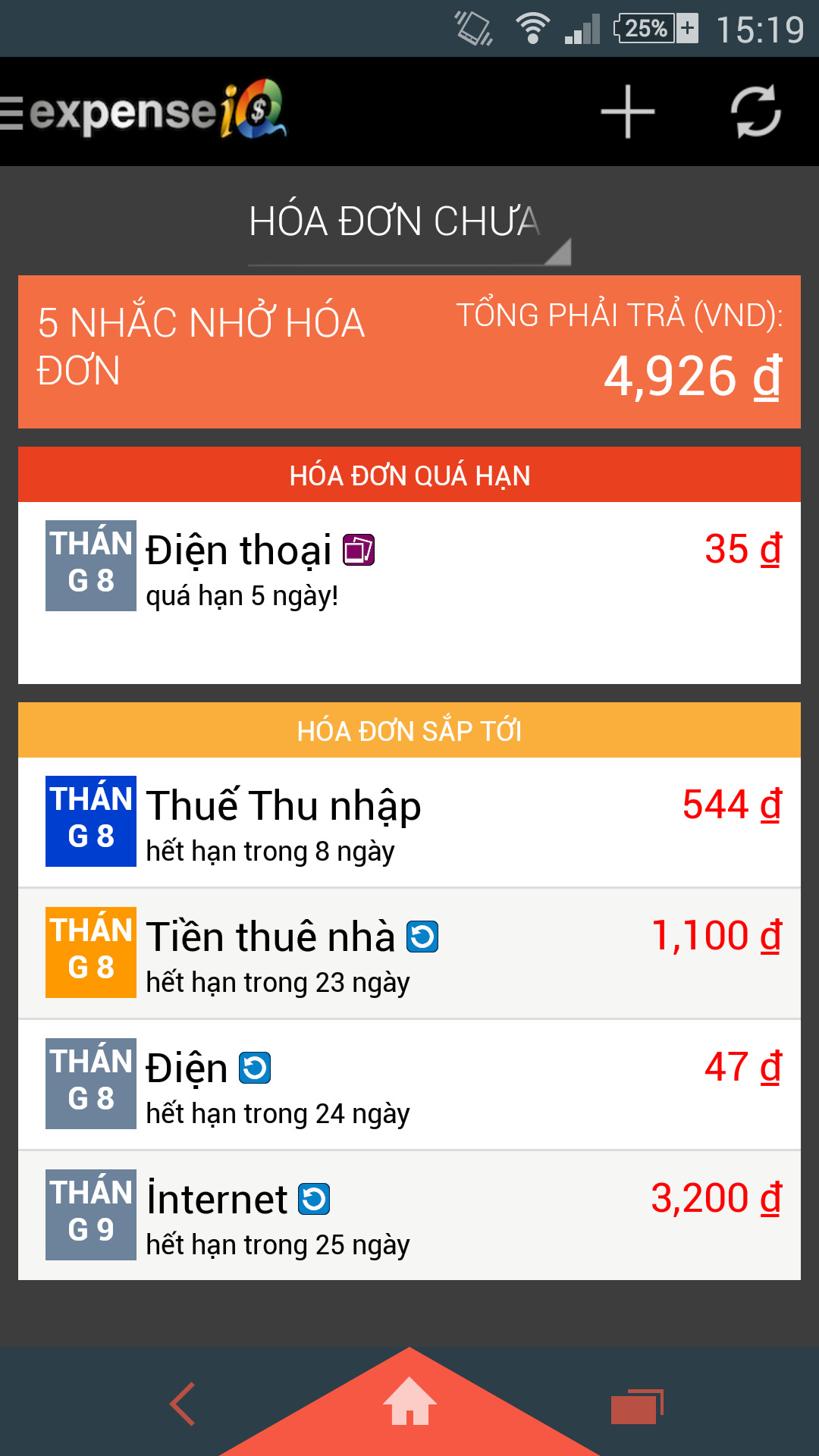 Quên thanh toán hóa đơn là một chuyện rất thường thấy trong cuộc sống bận rộn ngày nay, và không ai trong chúng ta mong muốn chuyện này bởi các công ty hay ngân hàng thường sẽ tính thêm phí đóng tiền trễ hạn. Để giúp bạn khắc phục vấn đề này, Expense IQ có tính năng Nhắc nhở Hóa đơn rất tiện dụng - bạn chỉ việc thiết lập các khoản thanh toán của bạn (cùng với hạn chót). Ứng dụng sẽ thông báo cho bạn biết khi có khoản thanh toán cần thực hiện, và bạn không còn phải bỏ công ghi nhớ các khoản thanh toán hóa đơn chi li hàng tháng nữa.