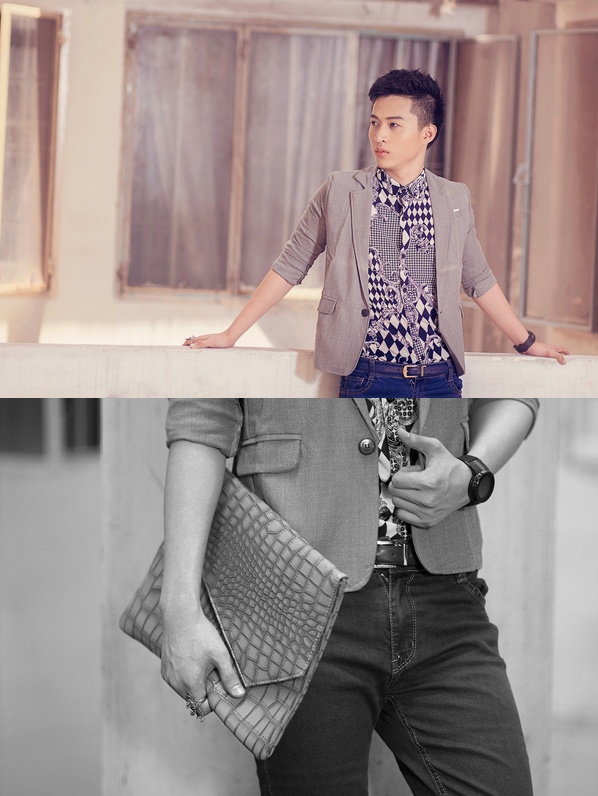 Áo sơ mi với những mảng họa tiết rối mắt được sử lí hài hòa hơn khi mix với vest xám. Thêm một chiếc túi cầm tay tạo nên phong cách thời thượng cho chàng.