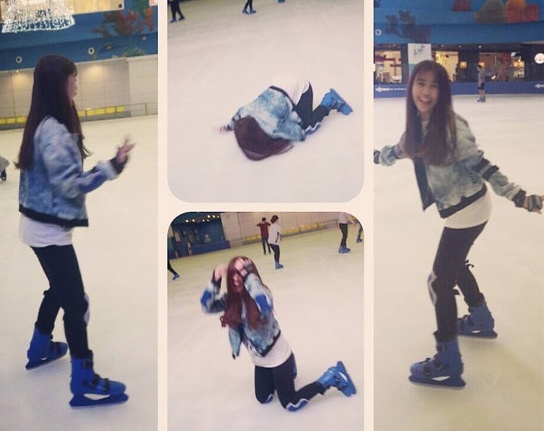 | Ngọc Thảo liên tục bị té khi lần đầu tham gia chơi trượt băng. |
