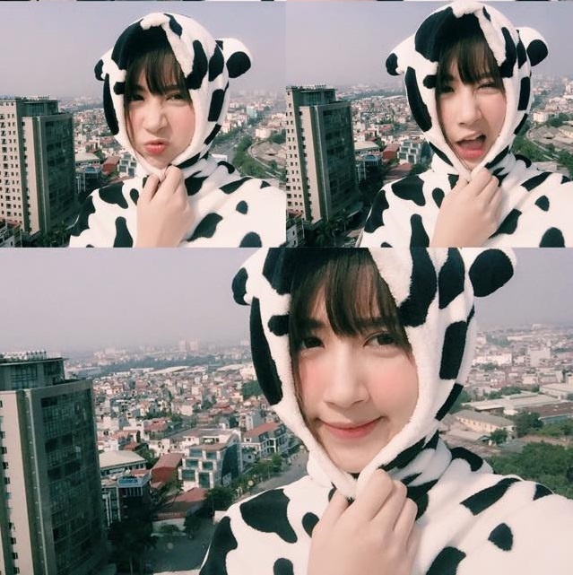 | Quynh Anh Shyn hài hước trong trang phục bò sữa chụp trên sân thượng. Bức ảnh cô chia sẻ ngày 22/12 thu hút gần 30.000 lượt (like). |